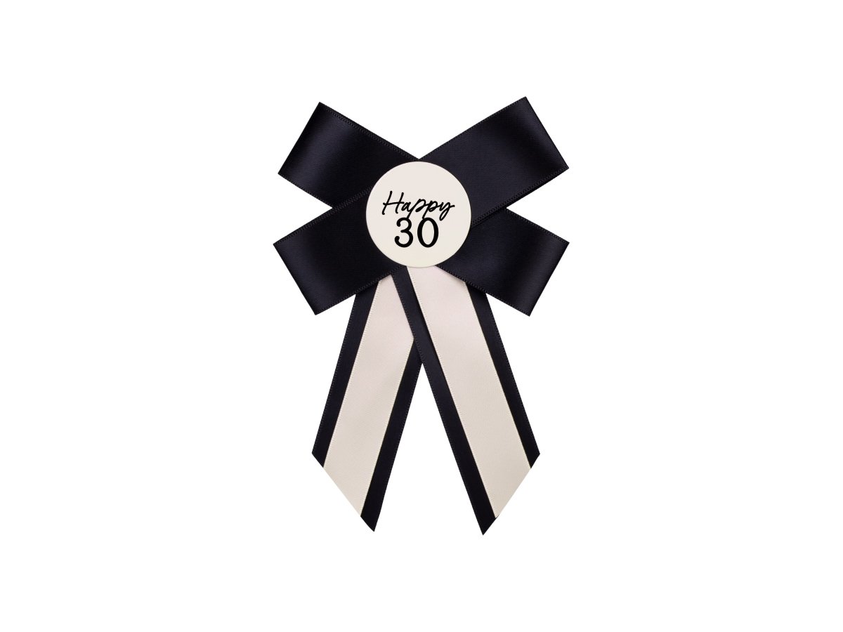 Bouton pour le 30e anniversaire en crème et noir, dimensions environ 11 x 17 cm. Le bouton est livré avec une épingle à nourrice.