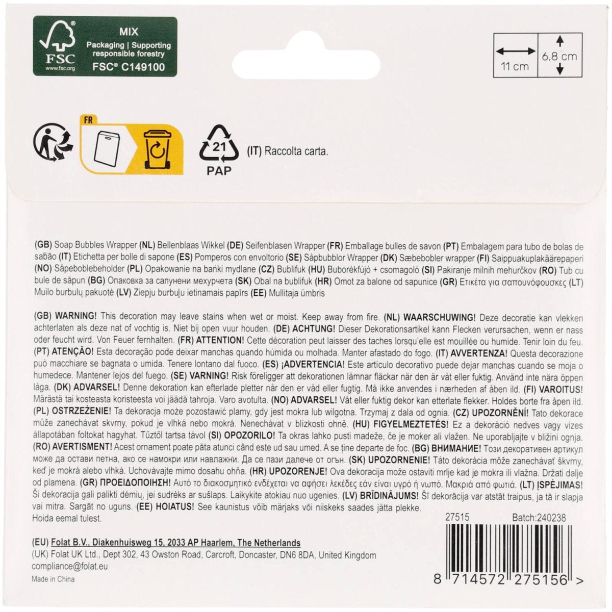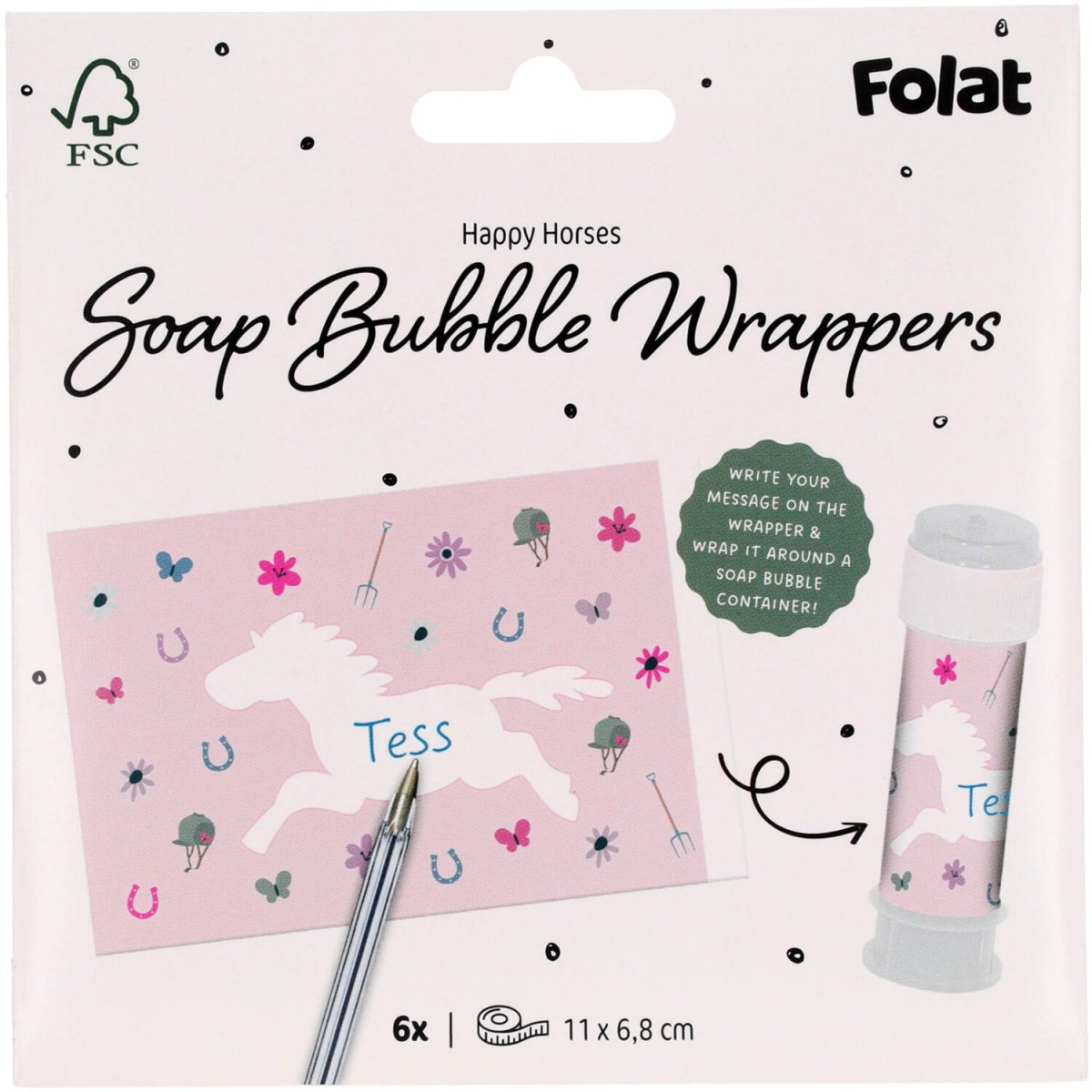 Pour chaque fan de chevaux, un souffleur de bulles. Autocollants souffleurs de bulles - Cheval heureux -6 pièces. Contenu : 6 autocollants souffleurs de bulles. À utiliser par exemple lors des fêtes/occasions suivantes : Fête d'enfants, Anniversaire, Fête à thème. Tout le monde peut faire des bulles. Ces autocollants de bulles de cheval s'adaptent à une bouteille de bulles standard et ont une taille de : 11 x 6,8 cm. Ils sont imprimés d'un seul côté. Ces autocollants de soufflage de bulles appartiennent à la collection Happy Horses de Folat. Cet article est fabriqué en papier.