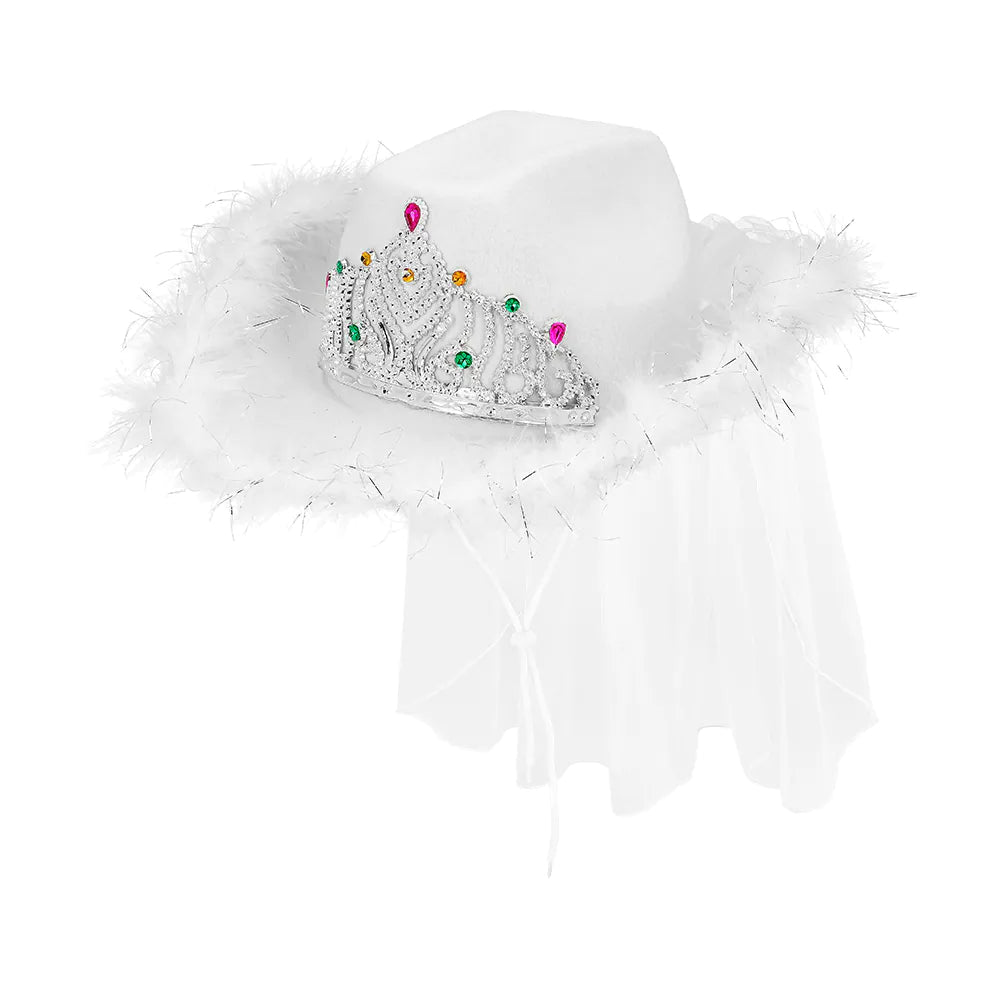 Ce joli chapeau Royal Bride est un ajout ludique à la tenue d'une mariée pour un enterrement de vie de jeune fille endiablé ! Le joli chapeau de la future mariée combine la robustesse d'un chapeau de cow-boy avec l'élégance d'un voile et le glamour d'un diadème. Amusement, rires et grands souvenirs garantis avec des photos inoubliables.