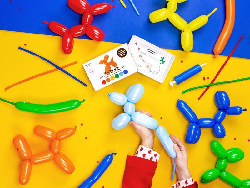 Modelage de ballons pastel avec pompe, mélange de couleurs : orange, bleu marine, rouge, jaune, lilas, bleu clair, vert. Taille environ 5 x 130 cm.