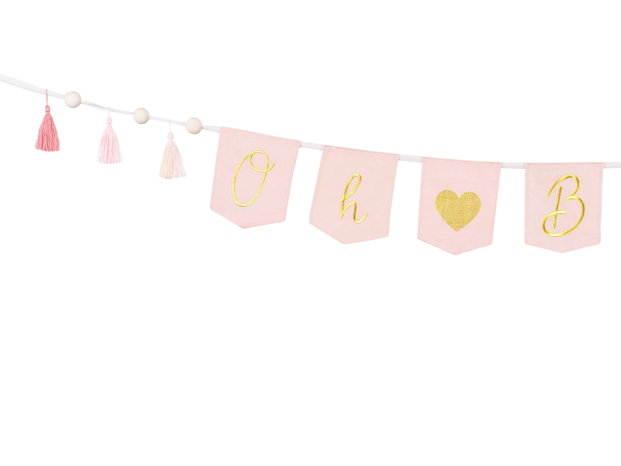 Bannière en coton Oh baby, rose clair avec des lettres dorées, des éléments en bois et des franges, longueur env. 2,5 m.