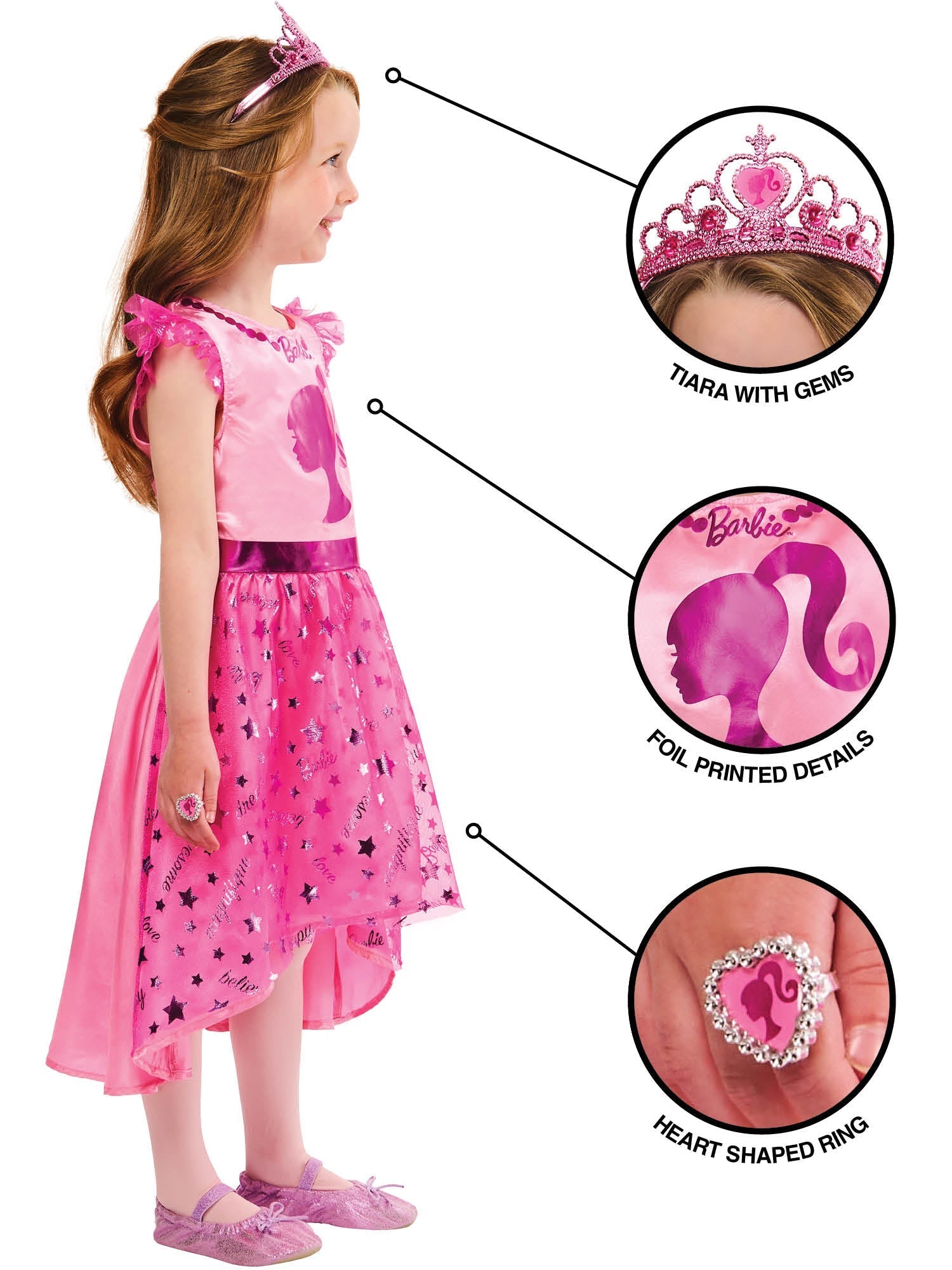Laisse ton enfant découvrir le monde de la mode et de l'amusement avec cet ensemble de déguisements de Barbie ! L'ensemble comprend une robe, un bandeau pour les cheveux, un bracelet et une bague, pour qu'ils puissent se glisser entièrement dans la peau de Barbie et créer leurs propres aventures élégantes. Parfait pour les soirées déguisées, les jeux de rôle ou les jeux d'imagination.