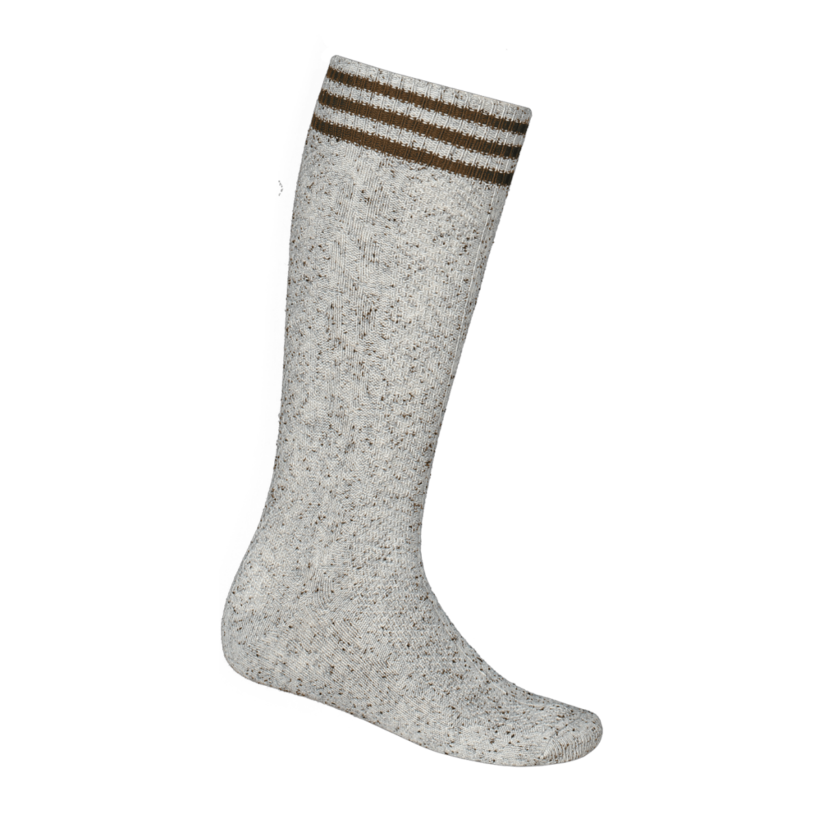 Longues chaussettes traditionnelles au genou, gris chiné, avec des rayures marron épicéa et un motif tricoté traditionnel. 47% coton, 47% polyamide