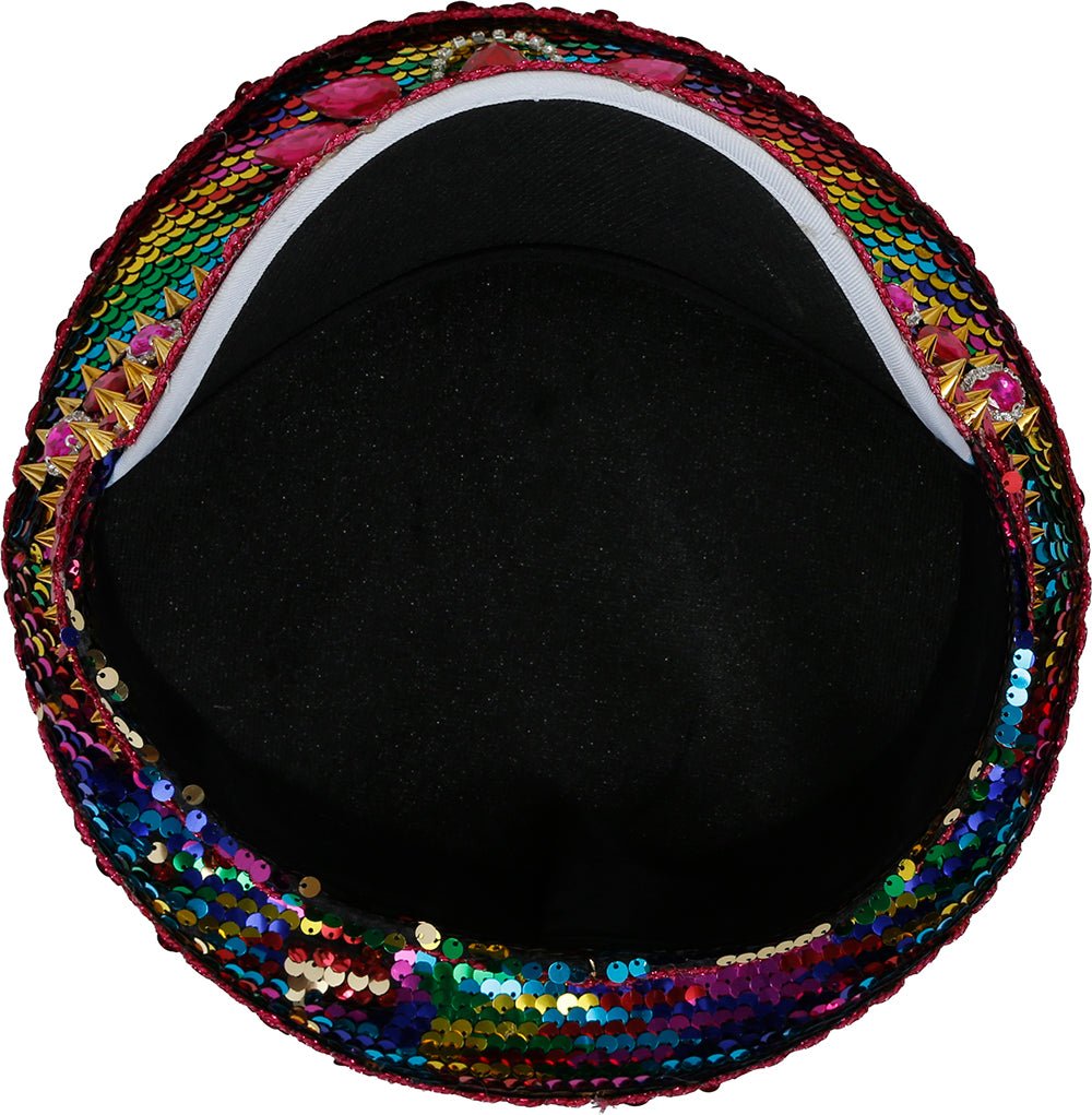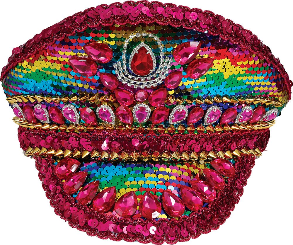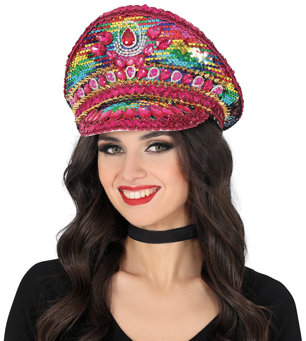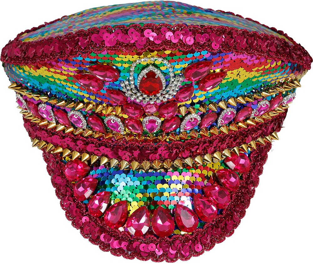 Fais-toi remarquer avec ce bonnet de police festif aux couleurs de l'arc-en-ciel, terminé par des pierres scintillantes et un bandeau rose. Une combinaison parfaite de dur et de ludique, idéale pour les fêtes et les festivals.