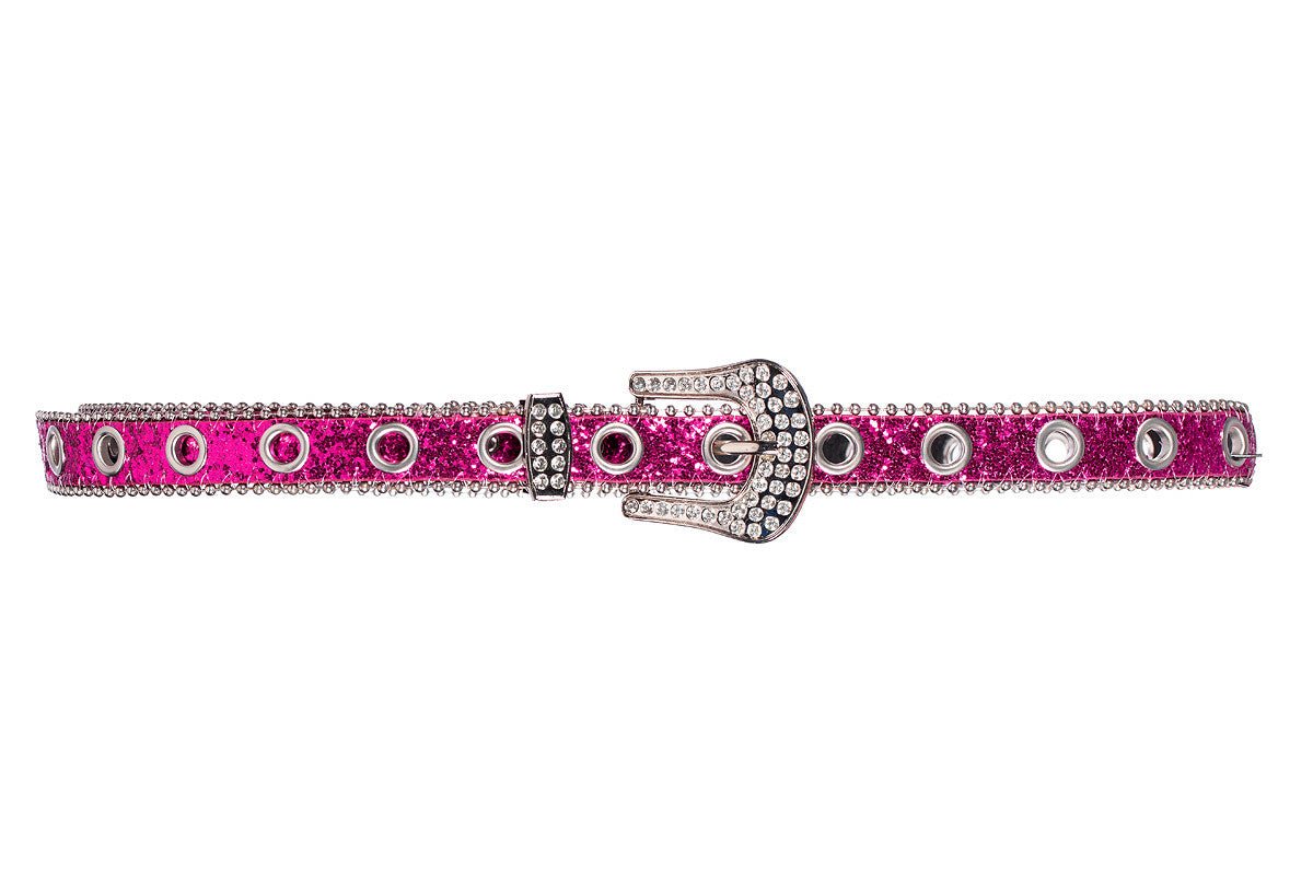 Ceinture accrocheuse avec paillettes et strass, incluant une boucle rose. Parfait comme accessoire pour les fêtes, les événements à thème ou les tenues de déguisement.