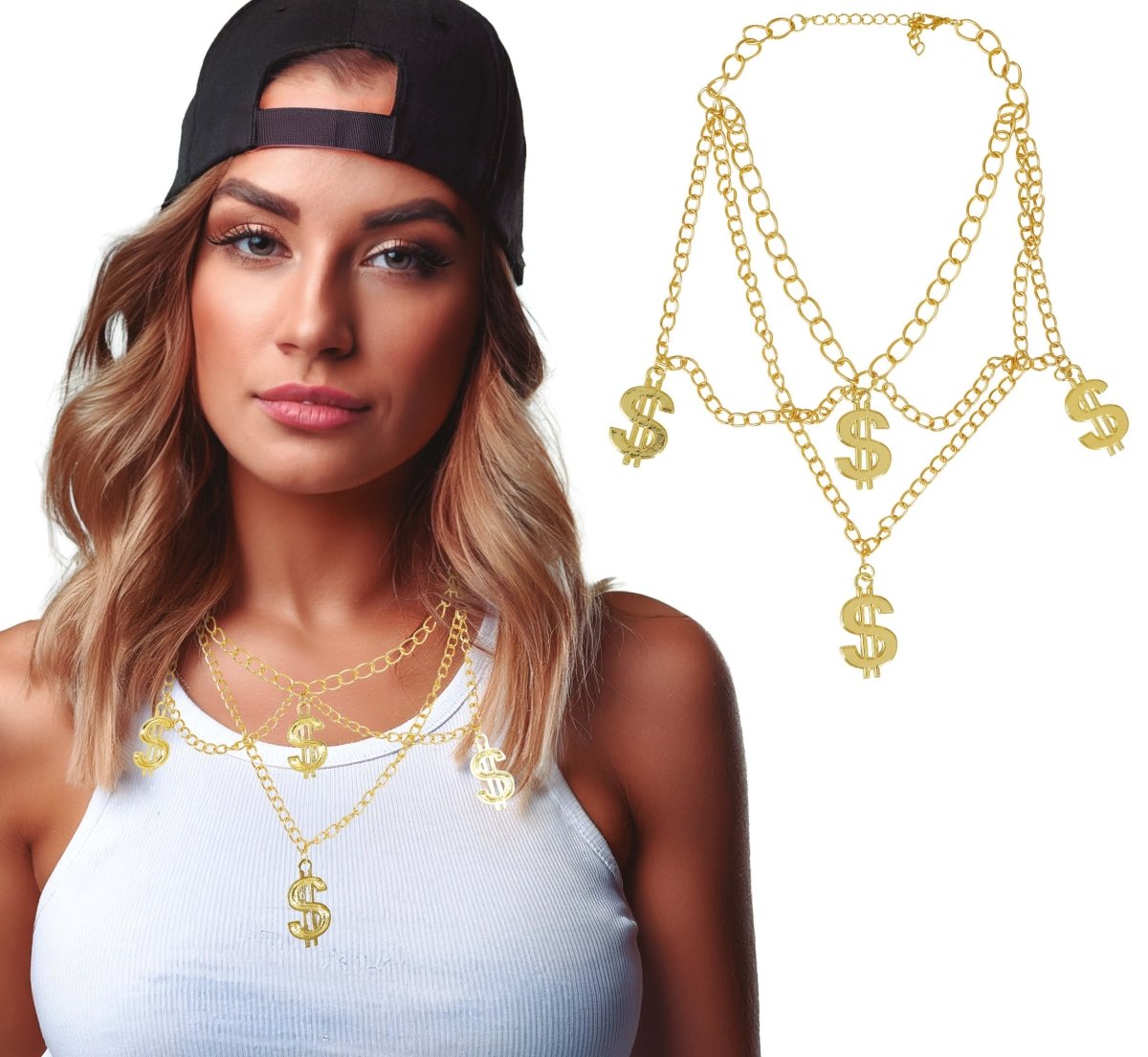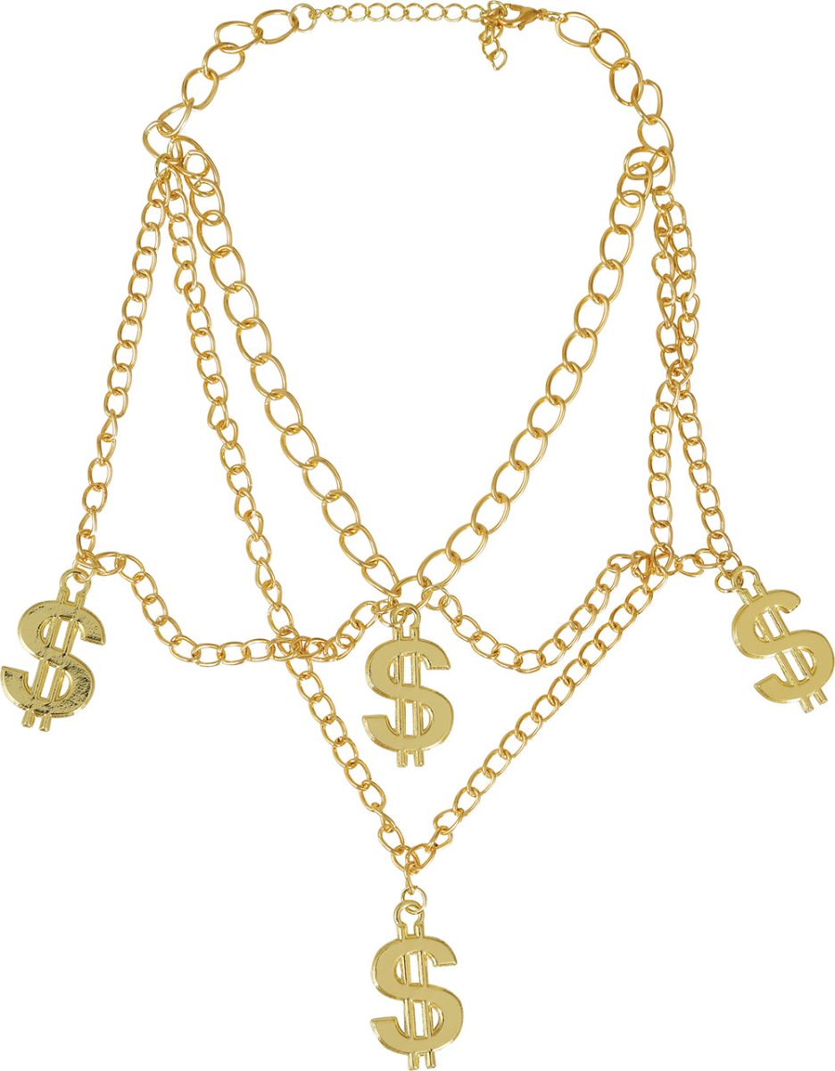 Fais une déclaration avec ce collier de dollars en or qui attire l'attention. Les quatre signes individuels du dollar créent un look ludique et extravagant, parfait pour les fêtes, les spectacles ou les soirées à thème.