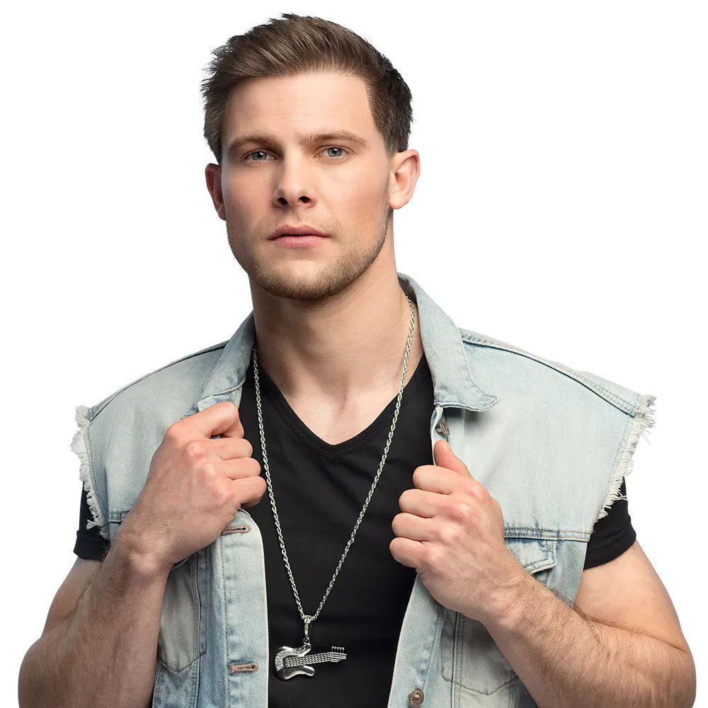 Tu cherches l'accessoire qui fera passer ton costume au niveau supérieur et qui mettra en valeur ta passion pour la musique ? Ce collier cool en argent avec guitare est conçu pour te faire briller comme une rock star ; que tu participes à une soirée à thème, que tu ailles à un carnaval ou que tu assistes à un concert.