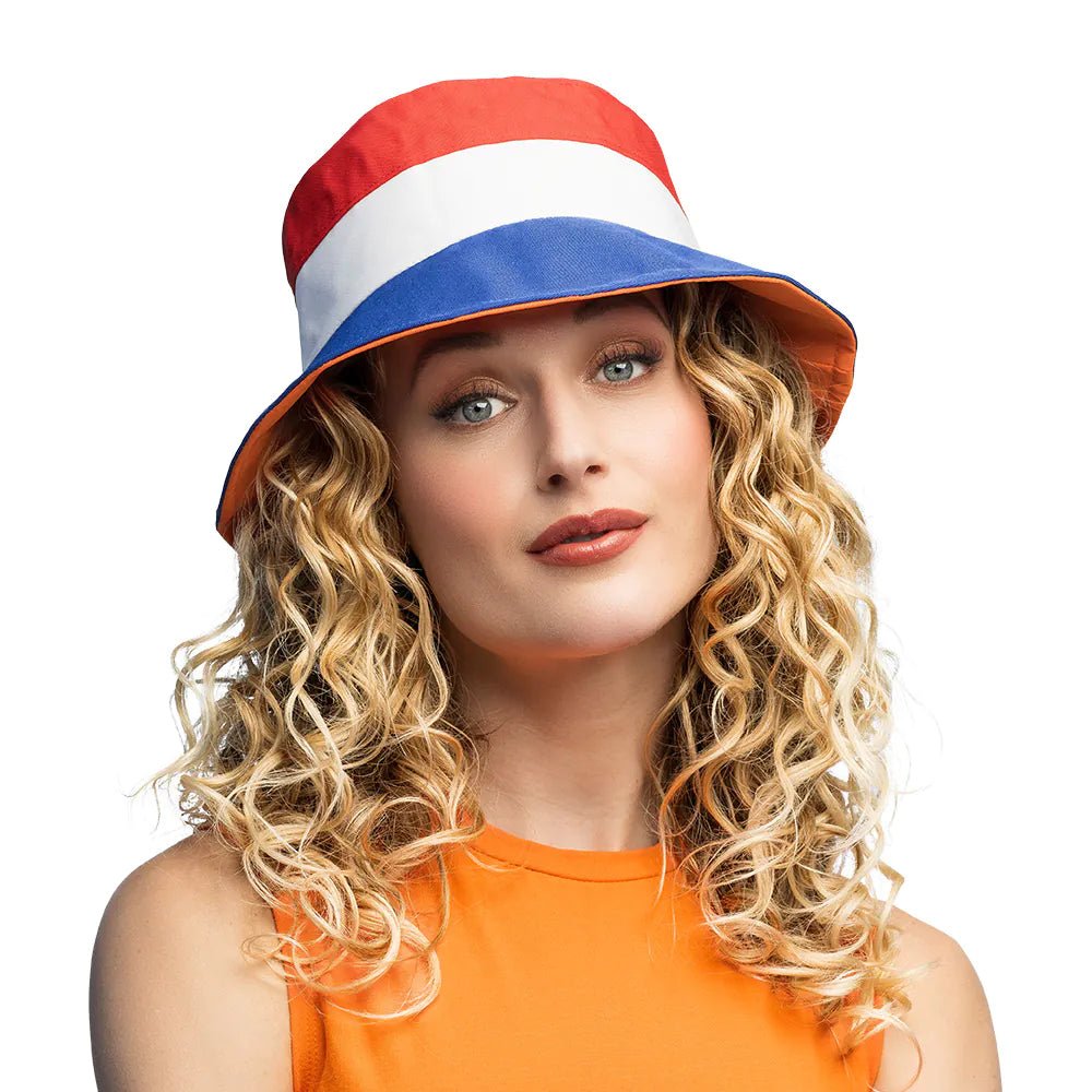 Le Bucket hat Holland est un chapeau élégant et pratique en rouge-blanc-bleu qui te permet d'apparaître complètement dans l'esprit hollandais. Idéal pour la fête du roi, les compétitions sportives et les festivals, grâce à sa coupe confortable et à ses matériaux légers.