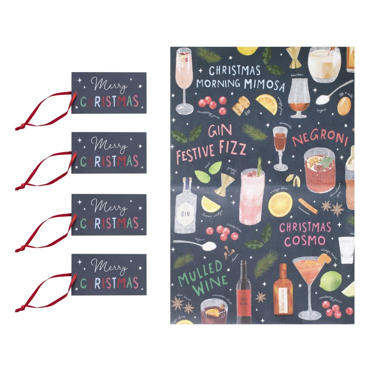 Chaque set contient 2 feuilles de papier cadeau de Noël cocktail mesurant 70 cm (L) x 50 cm (l). Comprend 4 étiquettes.