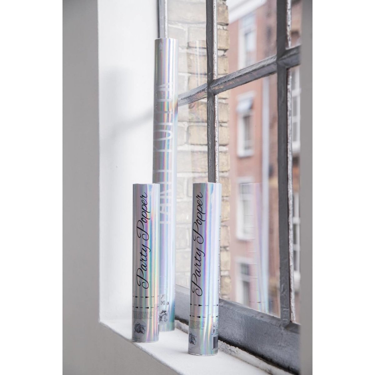 Canon à confettis Argent - 28cm. Contenu : 1 canon à confettis. Couleur : argent. À utiliser par exemple lors des fêtes/occasions suivantes : anniversaire, fête d'enfants et anniversaire. L'article a une longueur de 28 cm. L'article est fabriqué en plastique.