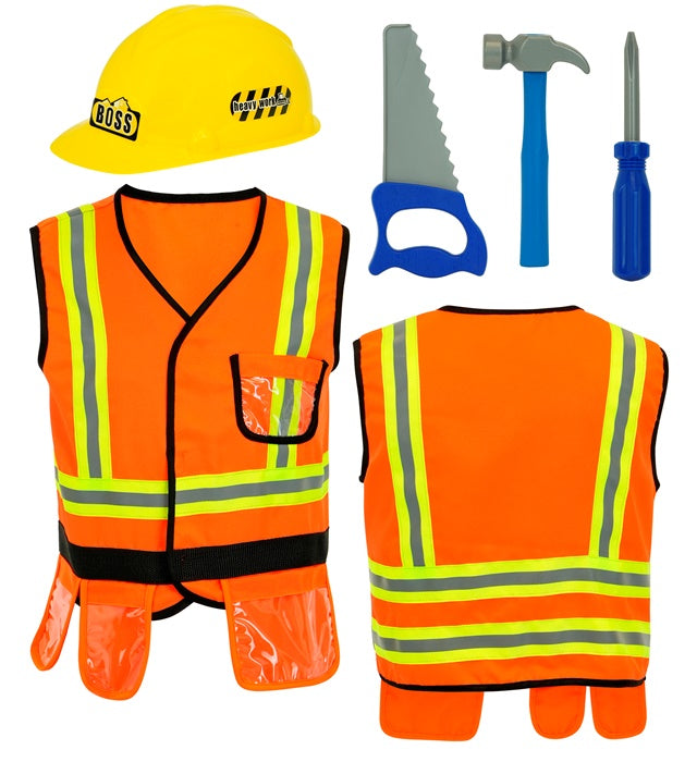 Contenu du costume: Gilet, casque, scie, marteau et tournevis