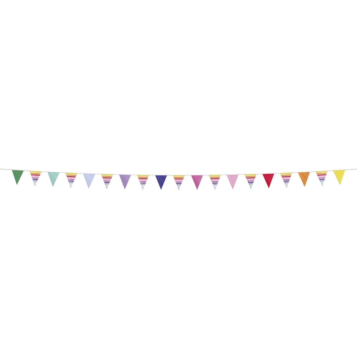 Aucune fête ne peut se passer de. Ligne de drapeaux - Stripetastic - 10 m. Contenu : 1 ligne de drapeaux. À utiliser par exemple lors des fêtes/occasions suivantes : Anniversaire, Fête à thème, Festival. Une ligne de drapeaux colorée avec un système de rangement pratique. Alternance de drapeaux colorés et de drapeaux à bandes horizontales colorées. Un drapeau mesure 21 x 30 cm. Il y a 19 drapeaux sur le ruban blanc de 10 mètres de long. Il y a 11 cm d'espace entre les drapeaux et 2 mètres aux deux extrémités pour les suspendre. Le dernier drapeau (22 x 32 cm) a également la fonction d'une pochette où les autres drapeaux peuvent être pliés. Cela permet de ranger, de conserver et de réutiliser très facilement cette ligne de drapeaux. Cet article est fabriqué en plastique.