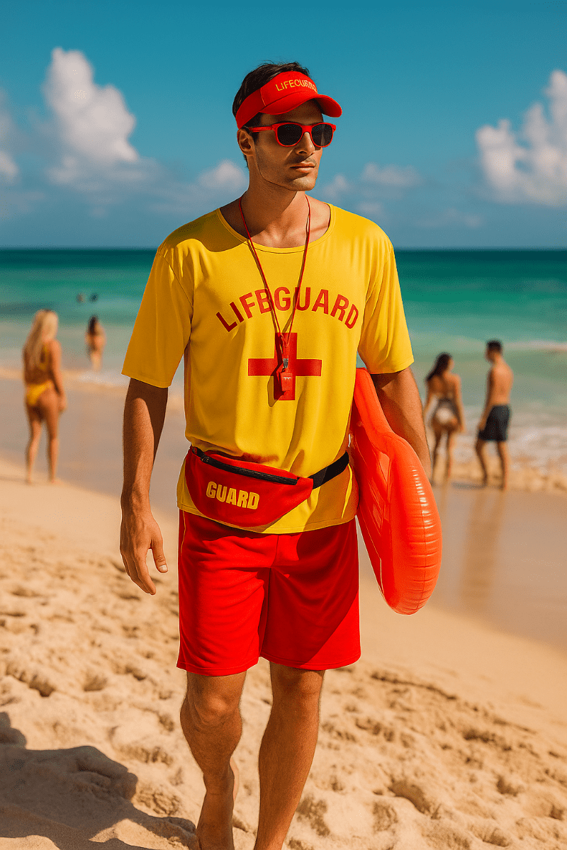 Avec ce look de sauveteur robuste et reconnaissable, tu es prêt à surveiller ou à faire la fête!