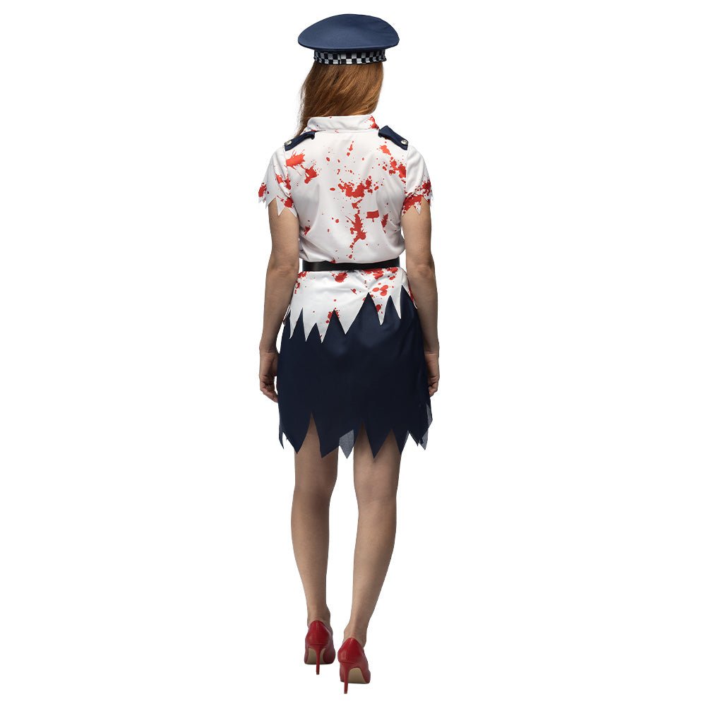 Que tu participes à une fête d'Halloween, que tu rendes les rues dangereuses pendant l'Halloween ou que tu fasses la chasse aux bonbons, ce costume de zombie effrayant pour femme te transformera en un rien de temps en terrifiant homme de main de la nuit. Complété par une chemise ensanglantée, une jupe et un bonnet de police et une ceinture assortis, ce costume crée un look d'Halloween glaçant qui ne manquera pas d'impressionner !