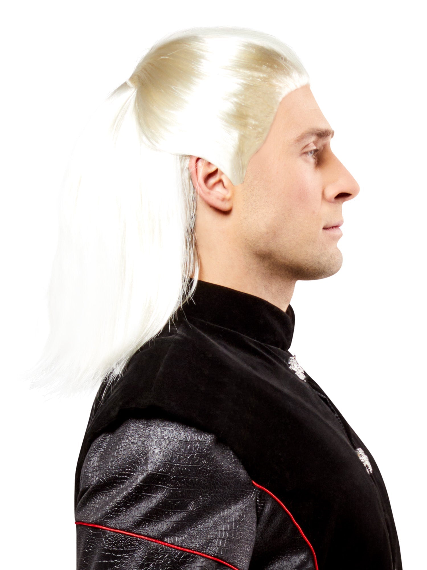 Complète le look enflammé de la maison Targaryen avec la perruque Daemon Targaryen ! Inspirée du personnage emblématique de la série Warner Bros La maison du dragon , cette perruque capture parfaitement la coiffure emblématique de Daemon Targaryen.