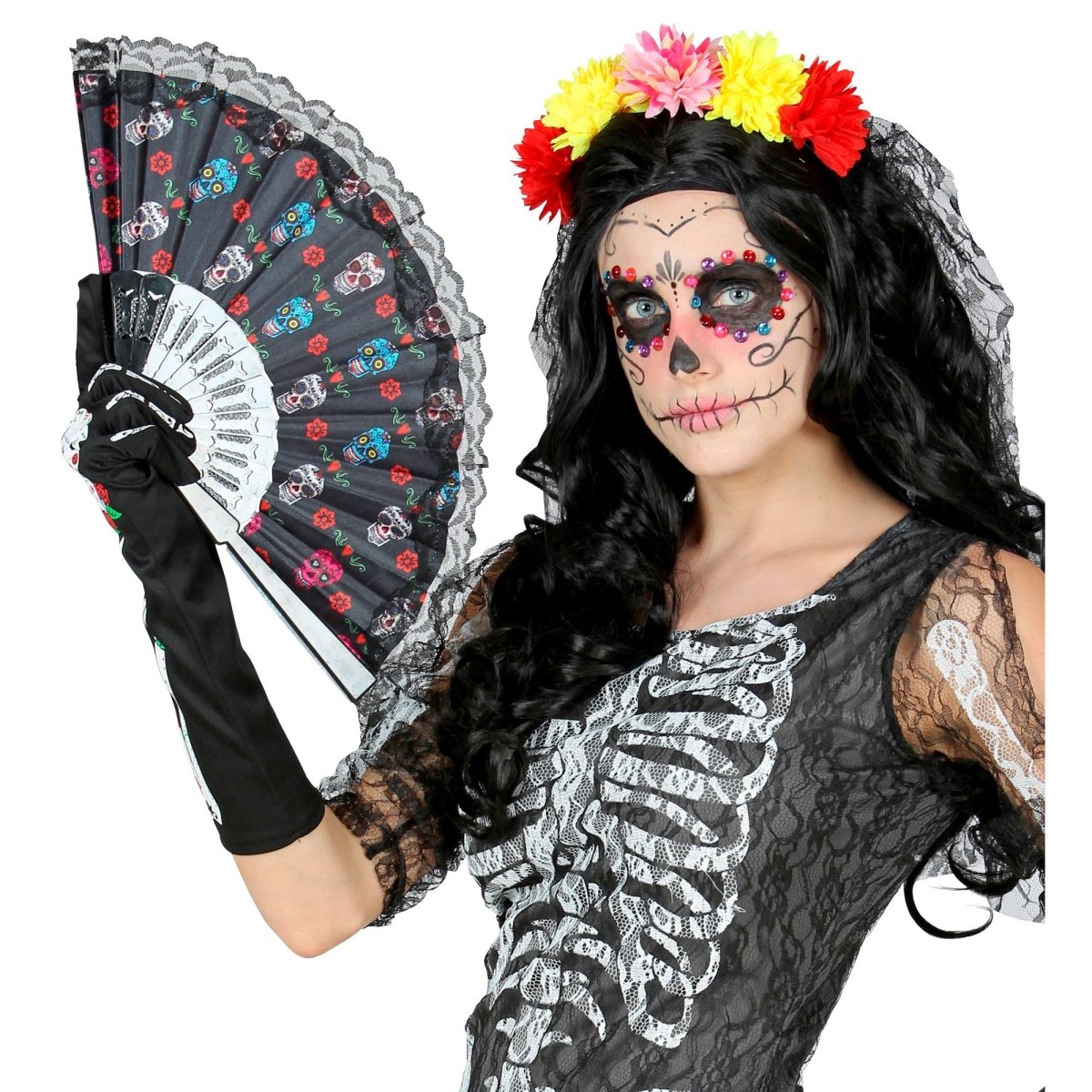 Éventail joyeux inspiré du Dia de Los Muertos, parfait comme décoration festive ou accessoire pour les fêtes à thème.