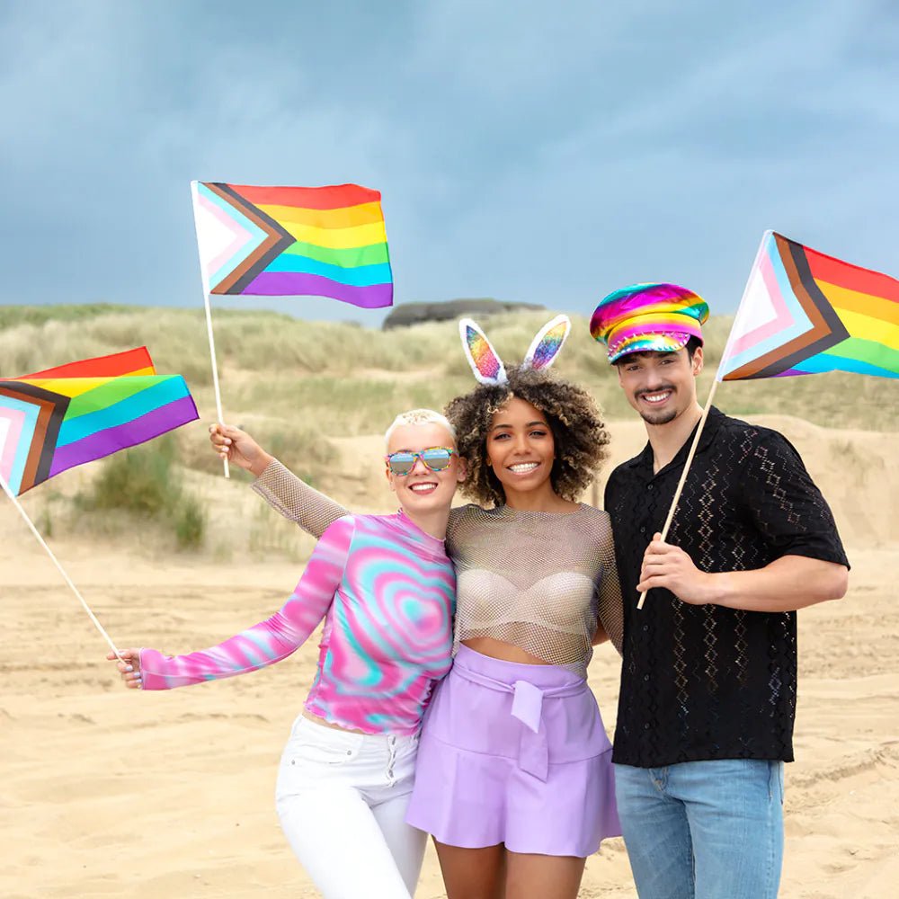 Un drapeau ondulant coloré en polyester avec un motif de progrès. Le drapeau à main en polyester mesure 30 x 45 cm et symbolise l'inclusivité et le progrès. Sympa à agiter pendant la Pride pour soutenir la communauté LGBTQ+.