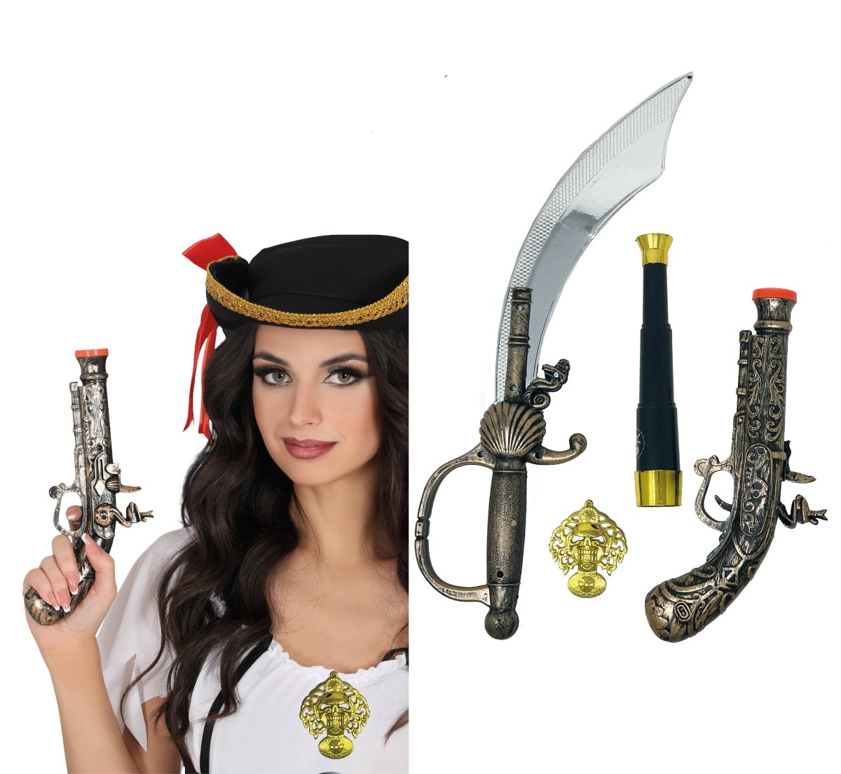 Pars à l'aventure comme un vrai pirate avec cet ensemble d'armes factices de 4 pièces. Complet avec une arme, un couteau, un télescope et une médaille - tout ce dont tu as besoin pour conquérir les sept mers pendant les soirées costumées ou les jeux de rôle.