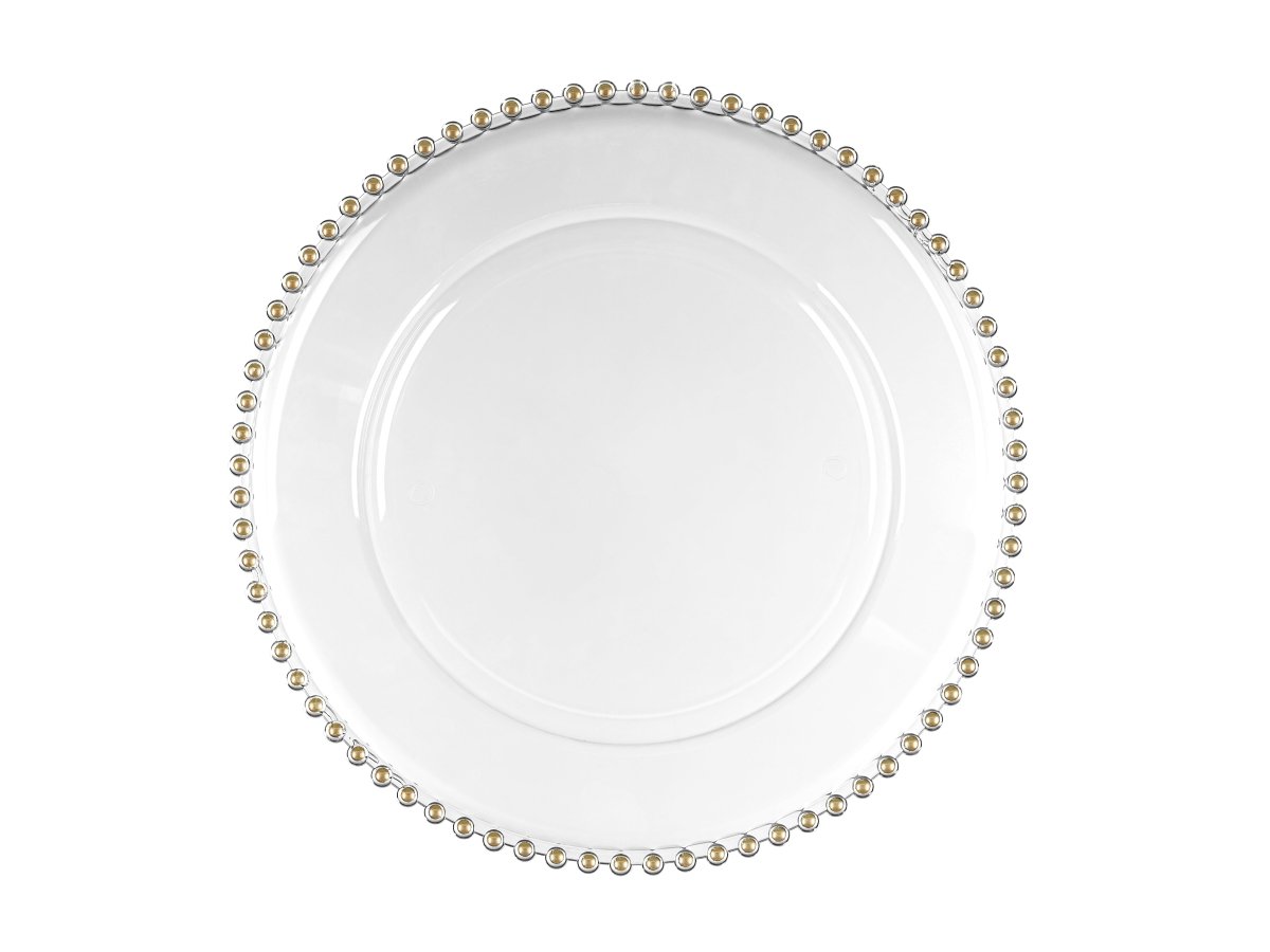 Assiette perlée en plastique transparent, diamètre d'environ 32 cm et profondeur de 3 cm.
