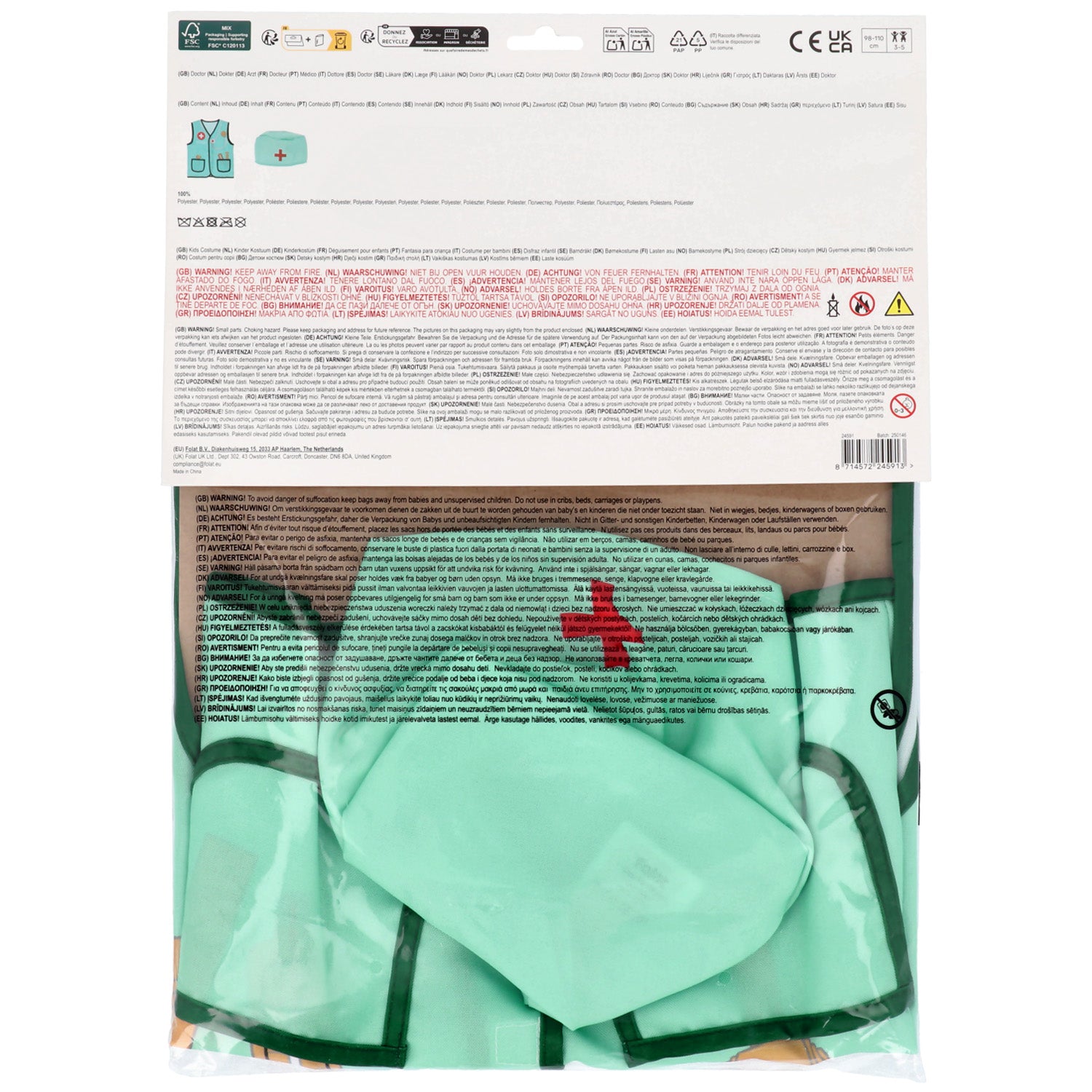 Docteur dans la chambre ! Avec cet ensemble de déguisement de docteur , chaque enfant est prêt à examiner et à aider les patients. Parfait pour les fêtes d'enfants, les soirées déguisées et le carnaval. L'ensemble comprend un gilet de médecin vert clair et un bonnet chirurgical assorti, tous deux ornés de détails médicaux reconnaissables.