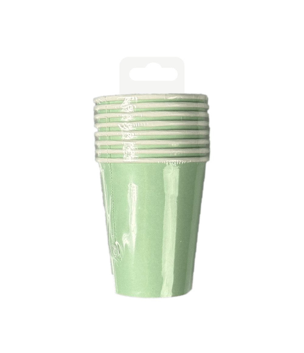 Les gobelets - vert pastel sont les articles de décoration parfaits lors d'une fête dont le thème est la couleur vert pastel. Ces gobelets mesurent 8,5 x 7 cm, sont emballés par 8 et s'accordent parfaitement avec les autres articles vert pastel tels que les confettis, les serviettes, les assiettes, les nappes, les boîtes à goûter et la ligne de drapeaux. Présente ces articles ensemble pour que le client comprenne immédiatement en quoi consiste cette collection. Ces gobelets sont fabriqués en papier, ce qui en fait un choix écologique !
