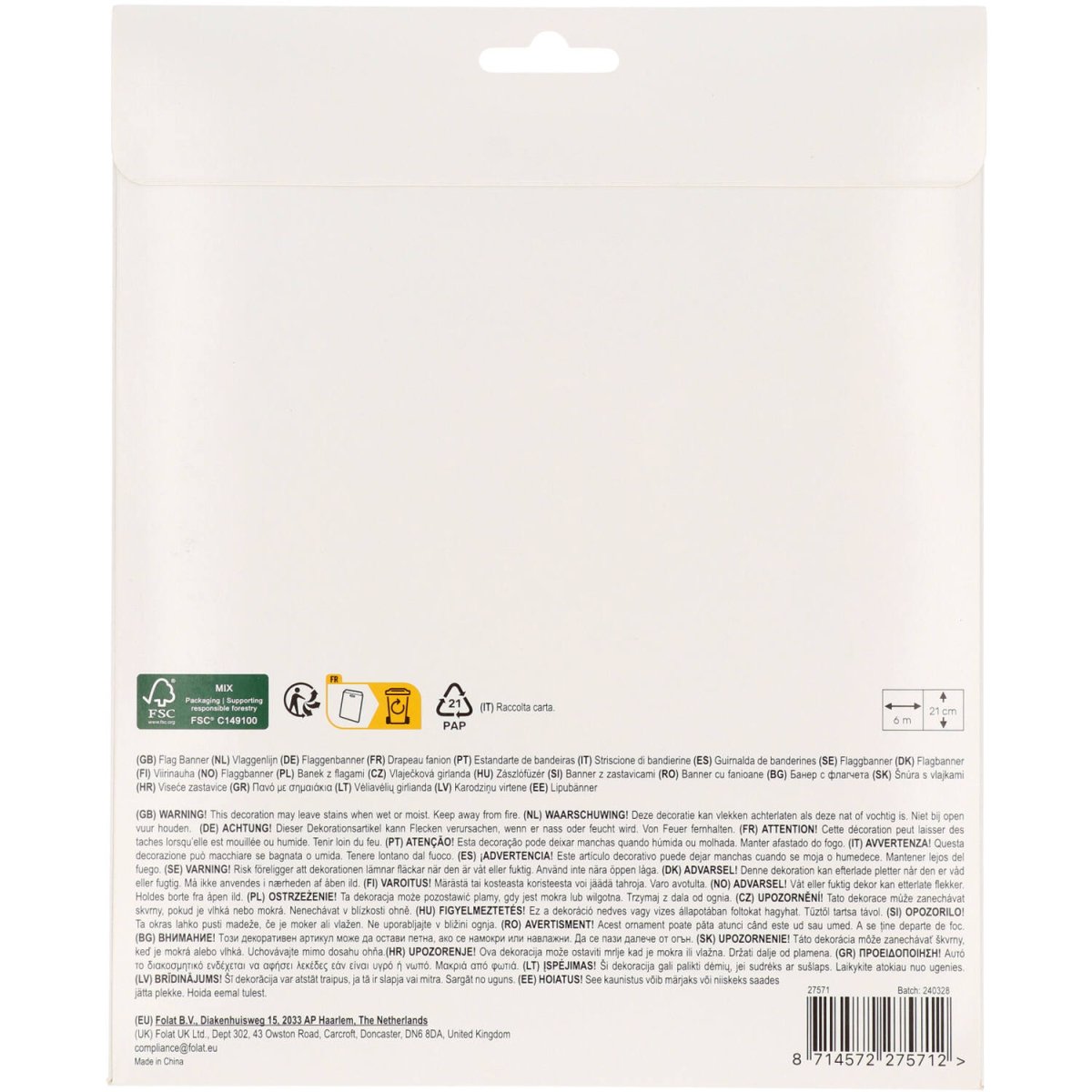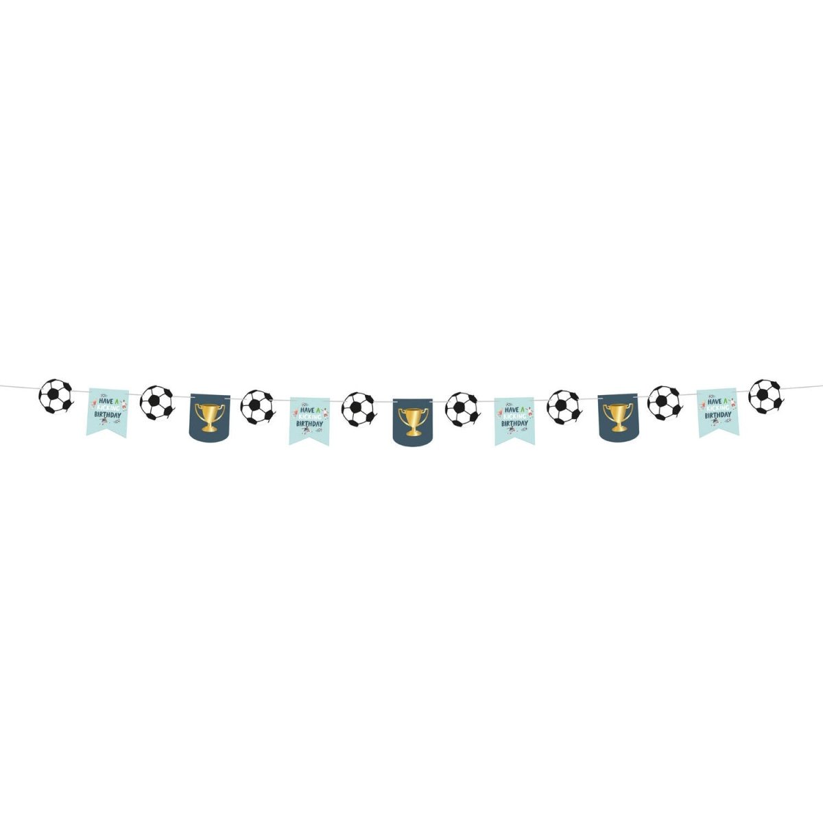 Pour les anniversaires des légendes du football ! Ligne de drapeau - Fantastic Football - 6 mètres. Contenu : 1 ligne de drapeau. A utiliser par exemple lors des fêtes/occasions suivantes : Fête d'enfants, Anniversaire. Sur cette ligne de drapeaux de 6 mètres de long, il y a 16 drapeaux d'une taille d'environ 17 x 21 cm. Il y a 3 types de drapeaux : un drapeau bleu clair en deux points avec le texte "HAVE A KICKING BIRTHDAY" et trois footballeurs, un en forme et aux couleurs d'un ballon de football et un bleu foncé aux coins arrondis avec sur lui une coupe de champion dorée qui brille vraiment grâce à la technique de marquage à chaud utilisée. Les drapeaux sont imprimés des deux côtés. Ils peuvent être glissés d'avant en arrière sur le ruban gris clair. Cette ligne de drapeaux appartient à la collection Fantastic Football de