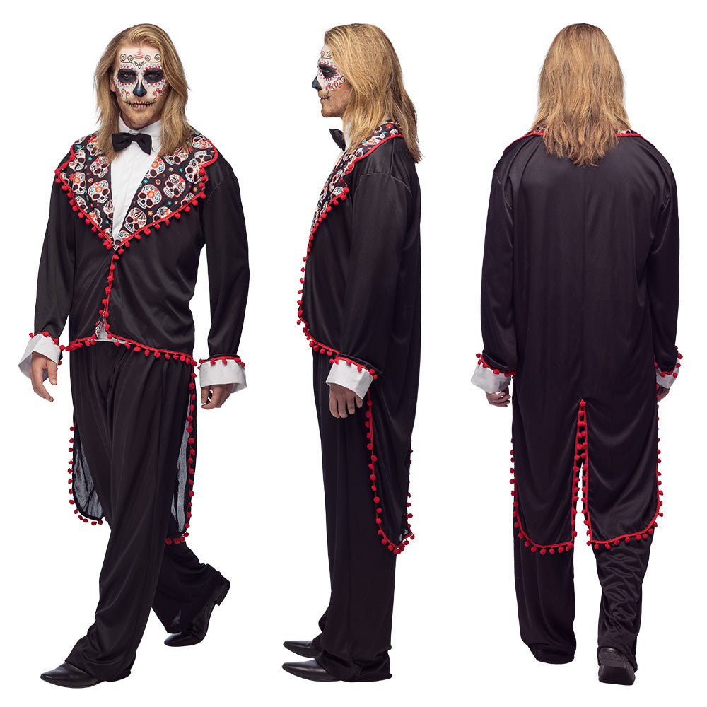 Un costume d'Halloween complet pour homme pour un look à la fois élégant et effrayant. Ce costume unique du jour des morts comprend une élégante veste à dos long avec un motif de crâne coloré et des détails mexicains, un pantalon long noir assorti et un chemisier blanc avec nœud papillon. La combinaison parfaite de squelettes effrayants avec des détails colorés et associés à de la peinture faciale, ce costume d'Halloween est le look ultime pour une fête d'Halloween ou une fête à thème.
