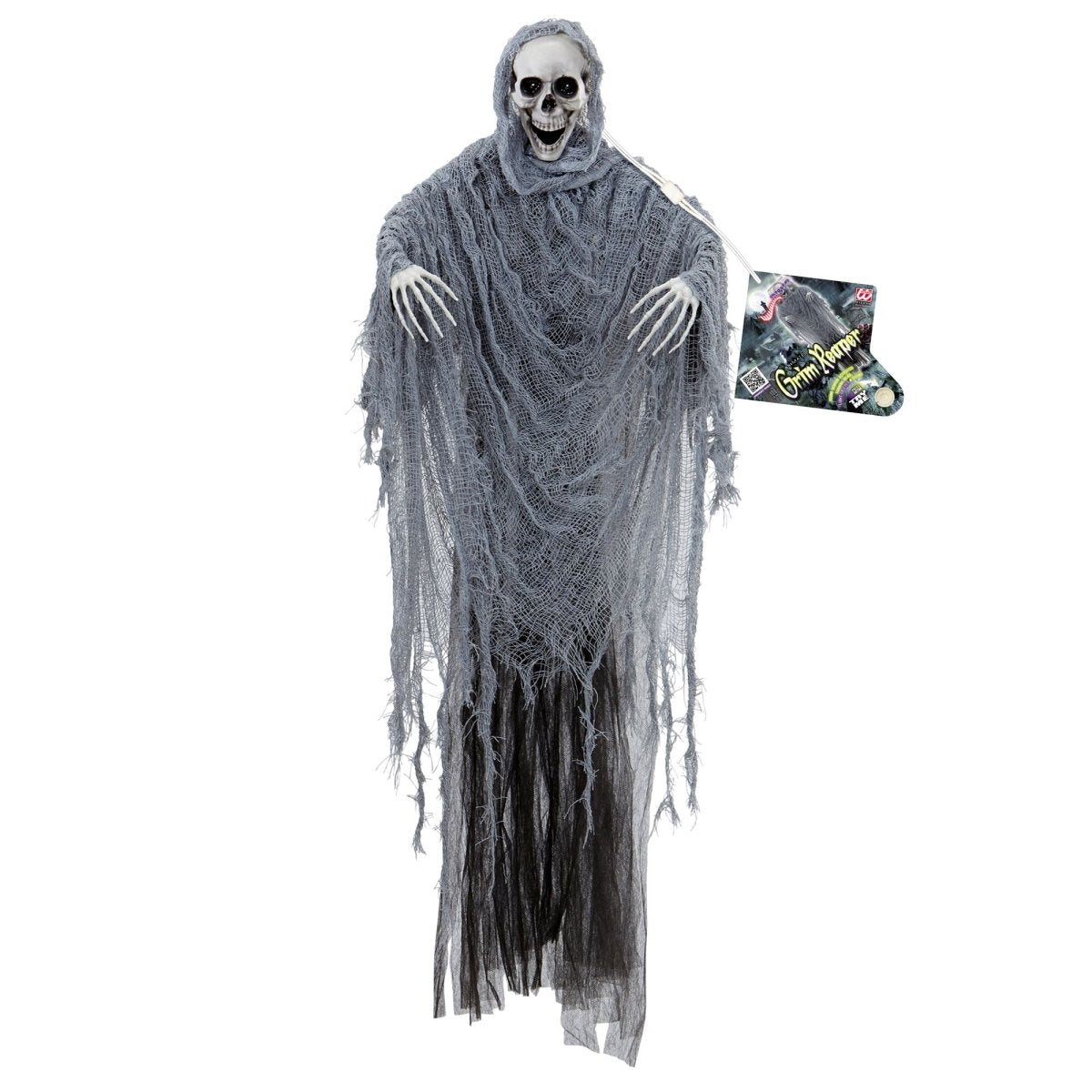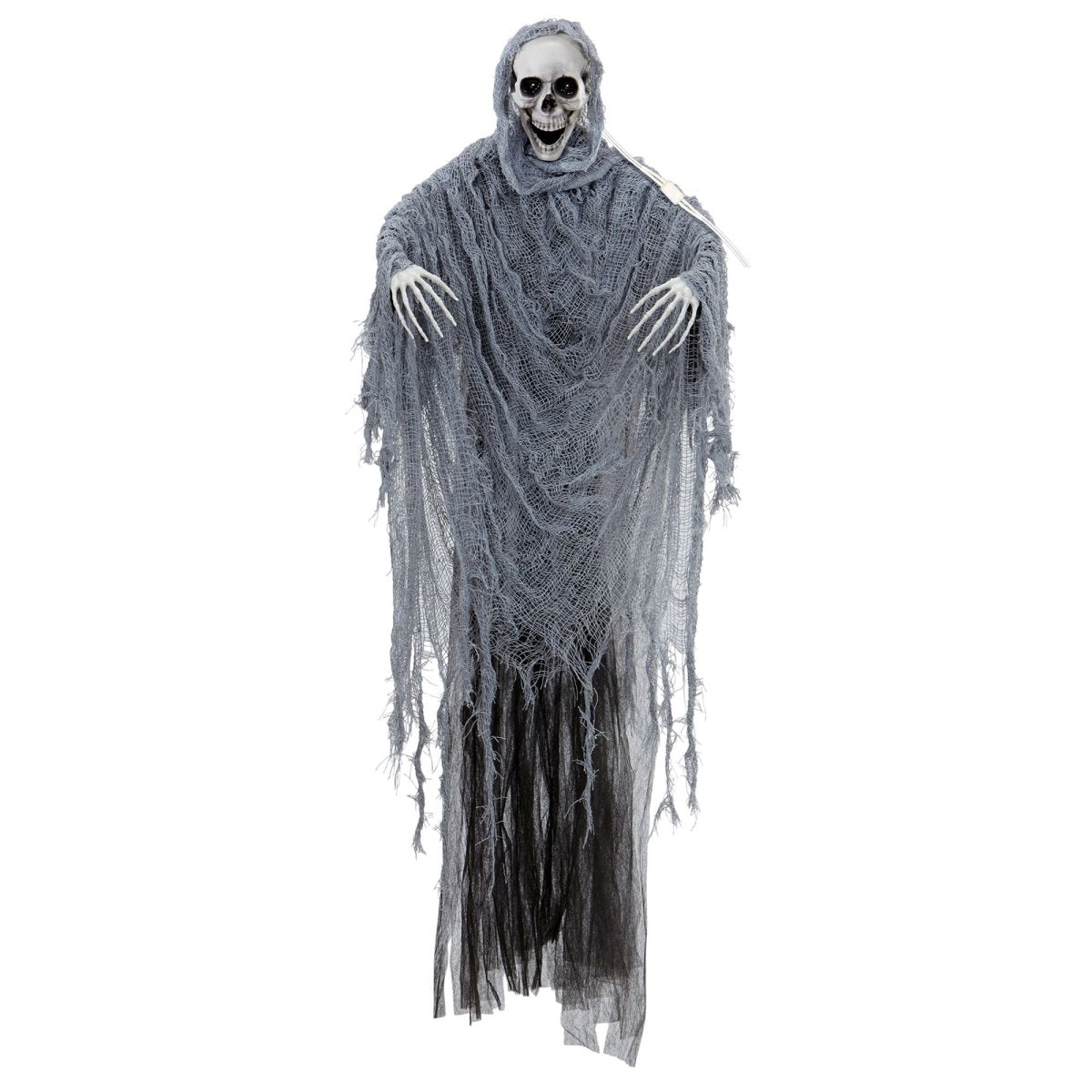 Apporte de l'excitation dans ta maison avec cette poupée faucheuse maigre d'Halloween mesurant 100 cm de haut. La poupée a une tête mobile, des yeux lumineux et émet des sonorités effrayantes pour un effet encore plus effrayant. Grâce à son sonde sonore , elle réagit aux sons à proximité et se met automatiquement à bouger et à parler. La poupée fonctionne avec des piles et s'allume facilement à l'aide d'un interrupteur.