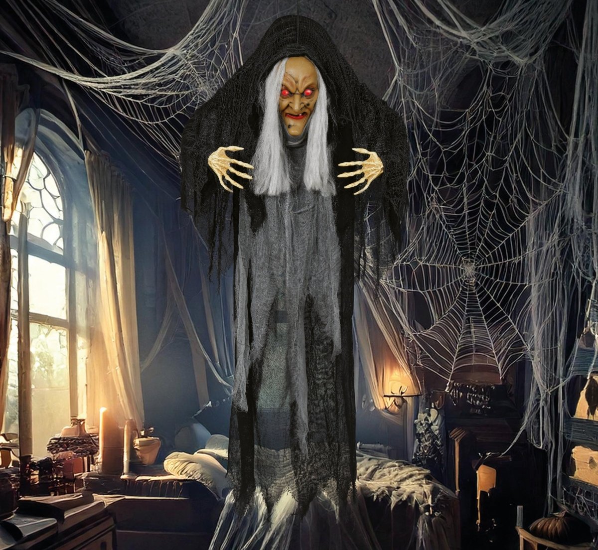 Poupée sorcière d'Halloween avec lumière, son et mouvement 1.20m