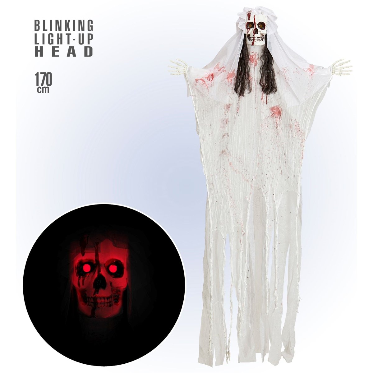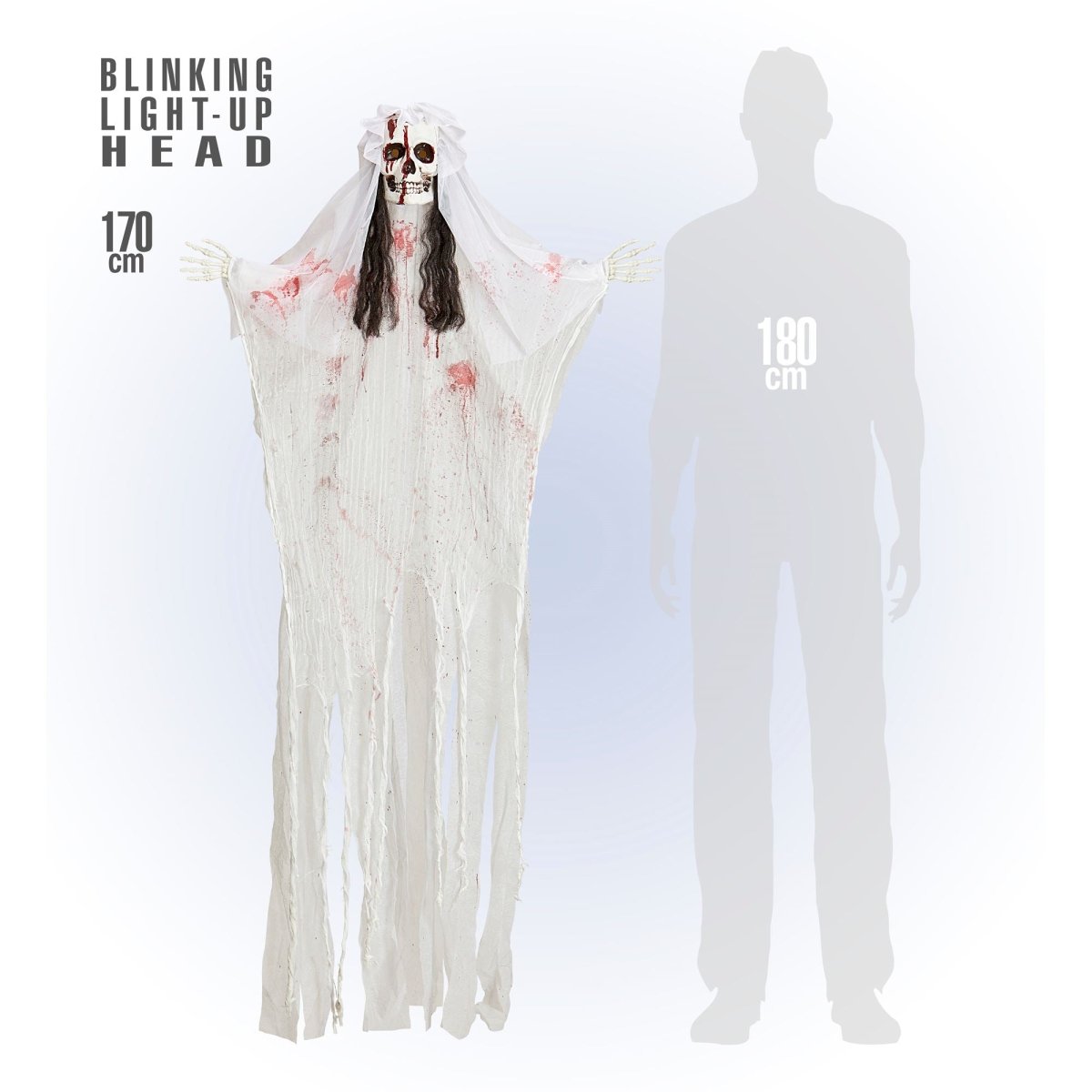 Ajoute une atmosphère effrayante à ta fête d'Halloween avec cette décoration suspendue lumineuse de mariée squelette. Un article impressionnant qui attire immédiatement l'attention.