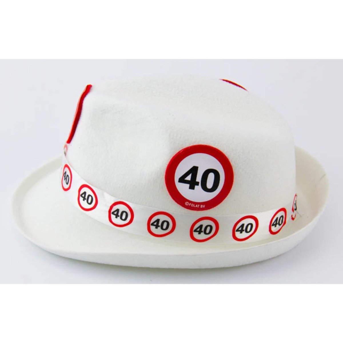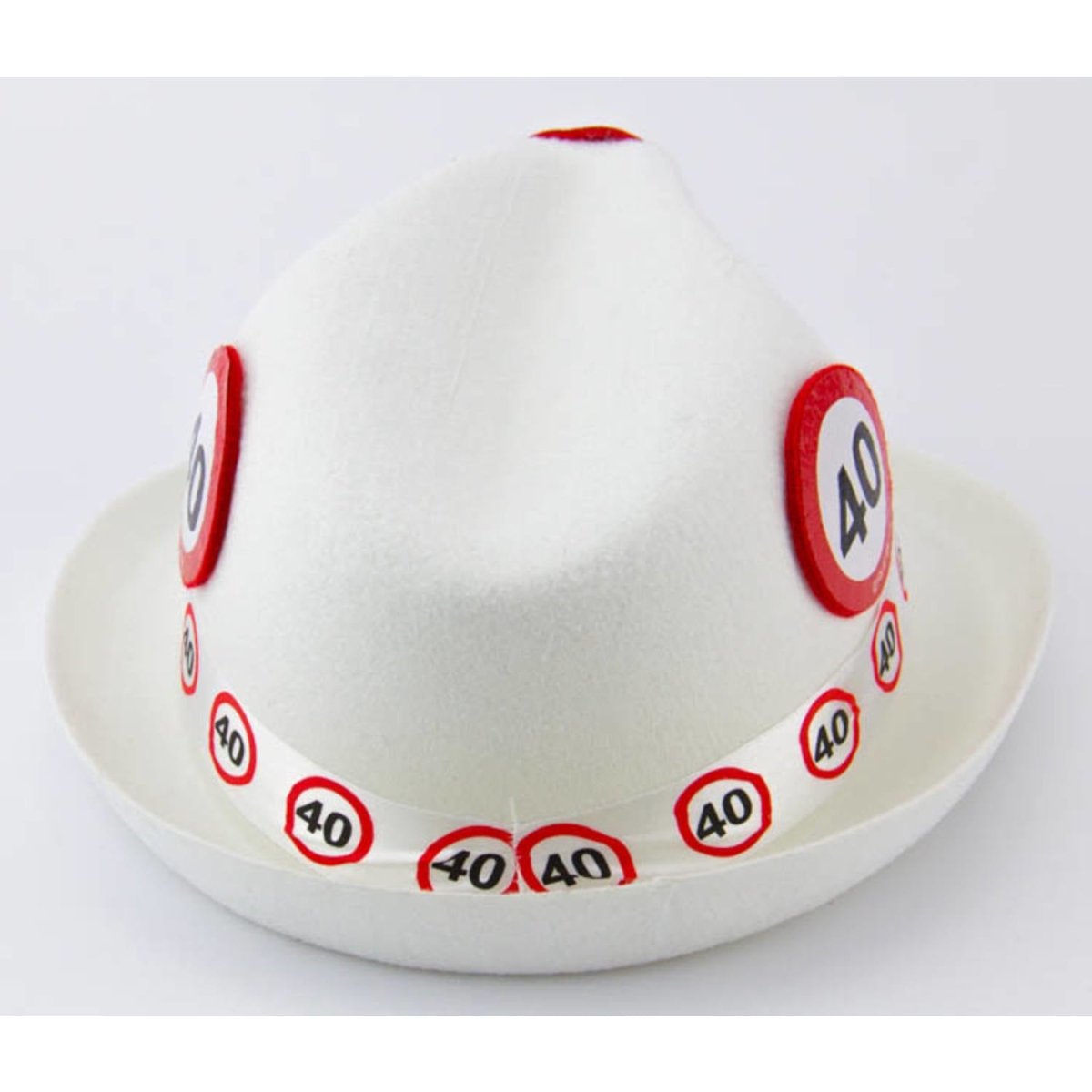 Chapeau trilby blanc panneau de signalisation de 40 ans. Contenu : 1 chapeau, couleur : blanc. À utiliser par exemple lors des fêtes/occasions suivantes : Carnaval, fête à thème, Halloween. Ce chapeau mesure 23 cm de large et 37 cm de haut. L'article est fabriqué en polyester.