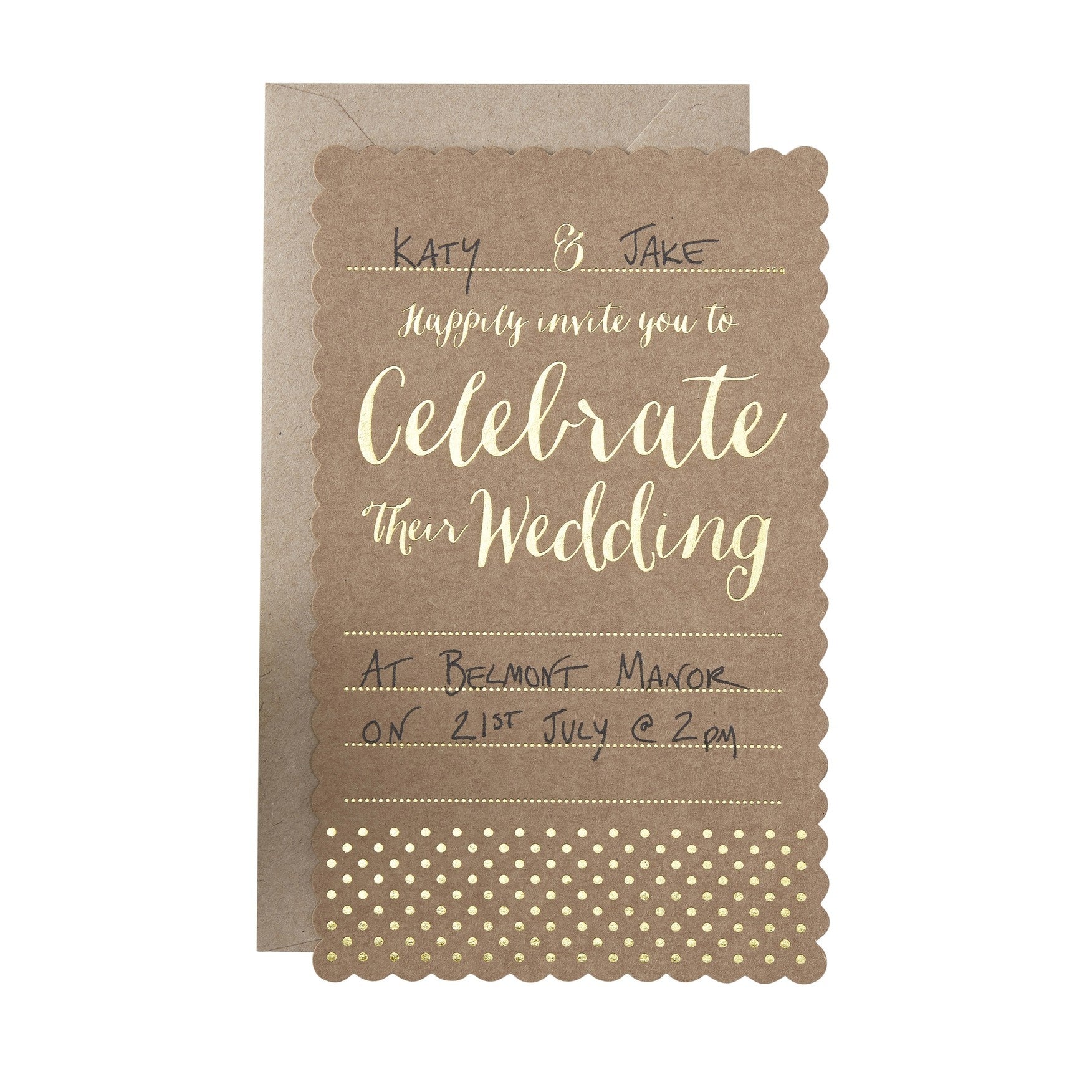 Ces invitations en kraft avec de magnifiques détails en feuille d'or esquissent l'ambiance du grand jour.