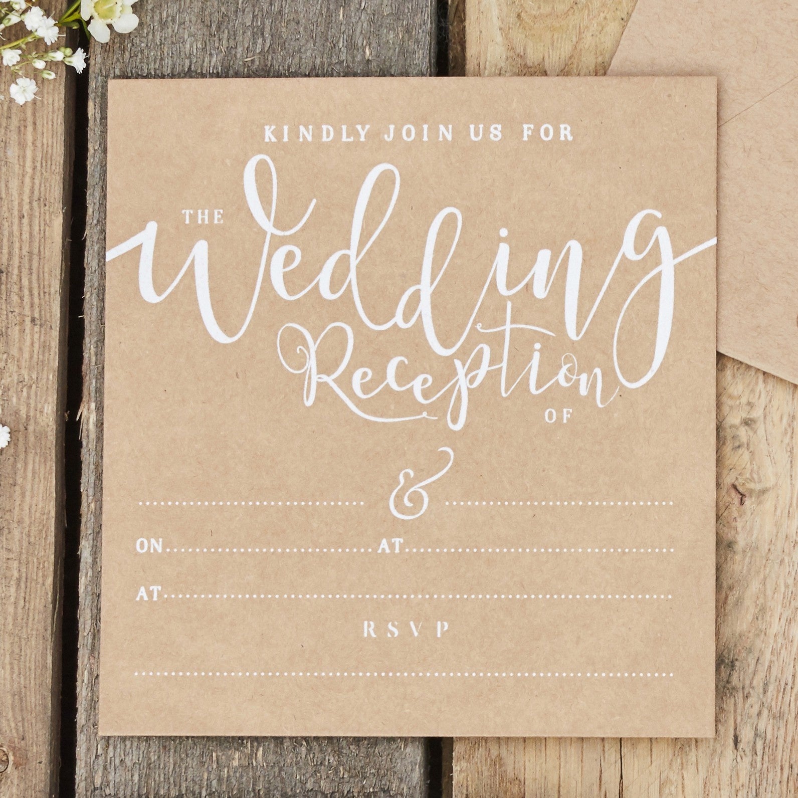 Commence ton thème champêtre rustique avec nos magnifiques "invitations de réception en kraft". Tes invités adoreront ouvrir ces magnifiques invitations. La belle écriture blanche et nette est compensée par le fond rustique en papier kraft. L'invitation parfaite pour demander à tes amis de faire la fête avec toi.