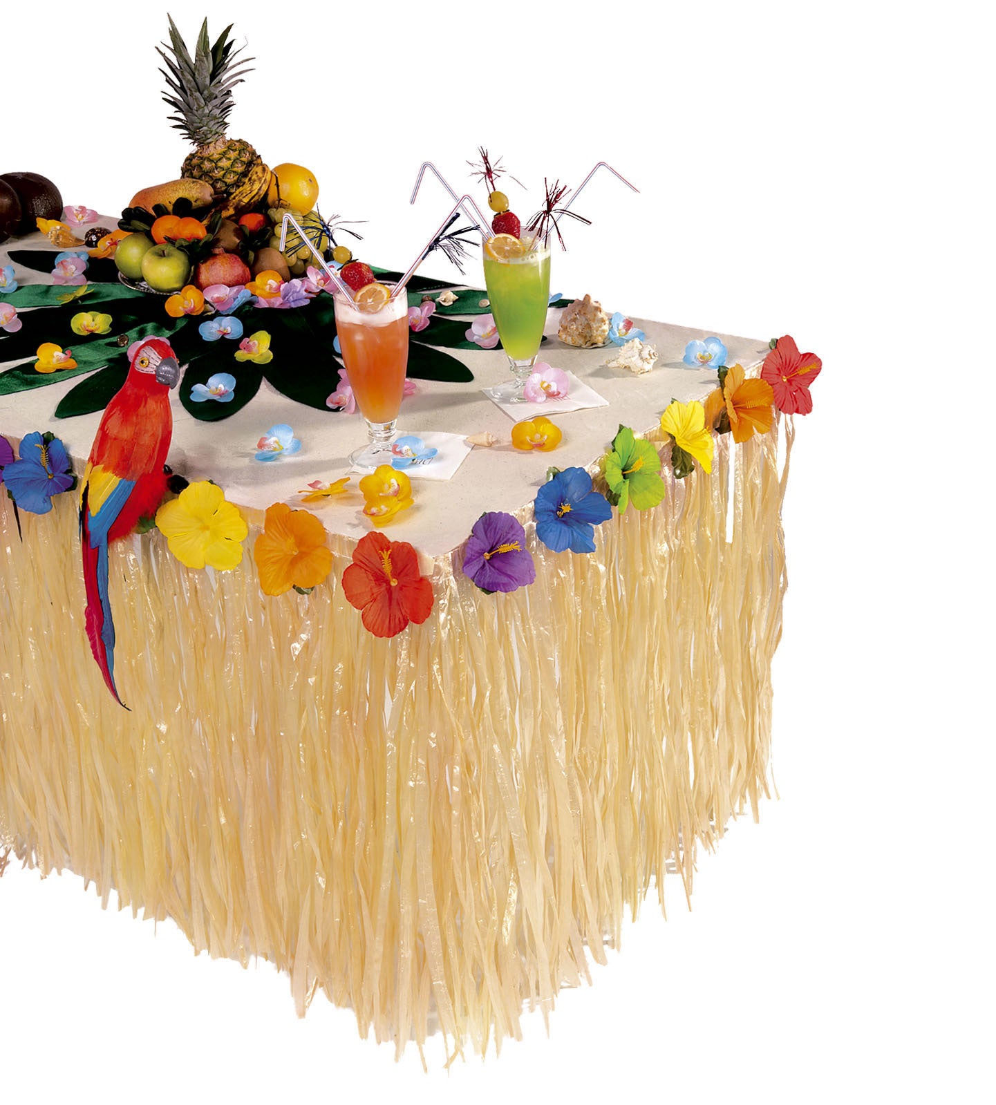 Description Critiques À propos de ce produit Description : jupe de table tropicale avec fleur d'hibiscus - 275x75 cmMatière : corde : 100% pe - franges : 100% polyesther - fleurs : 100% polyesther Trustpilot
