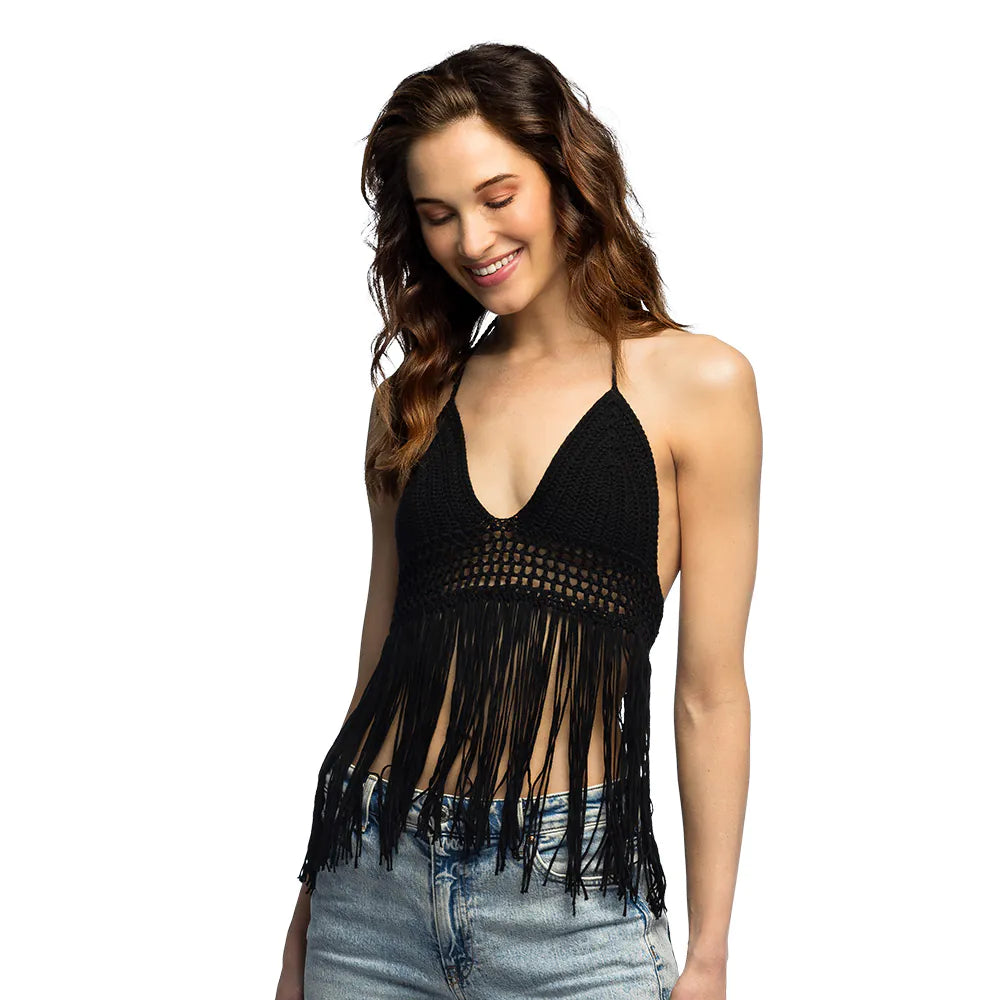 Laisse le soleil briller avec cet adorable haut noir en crochet de taille M ! Le motif décoratif au milieu et les franges ludiques en bas donnent à ce crop top un véritable look boho. Parfait pour attirer les regards lors de festivals, de fêtes sur la plage ou d'une journée ensoleillée en ville.
