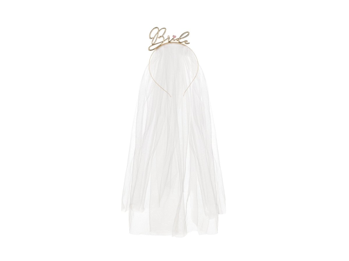 Contenu : Bandeau en métal avec inscription Bride en couleur or et voile blanc, longueur environ 50 cm.