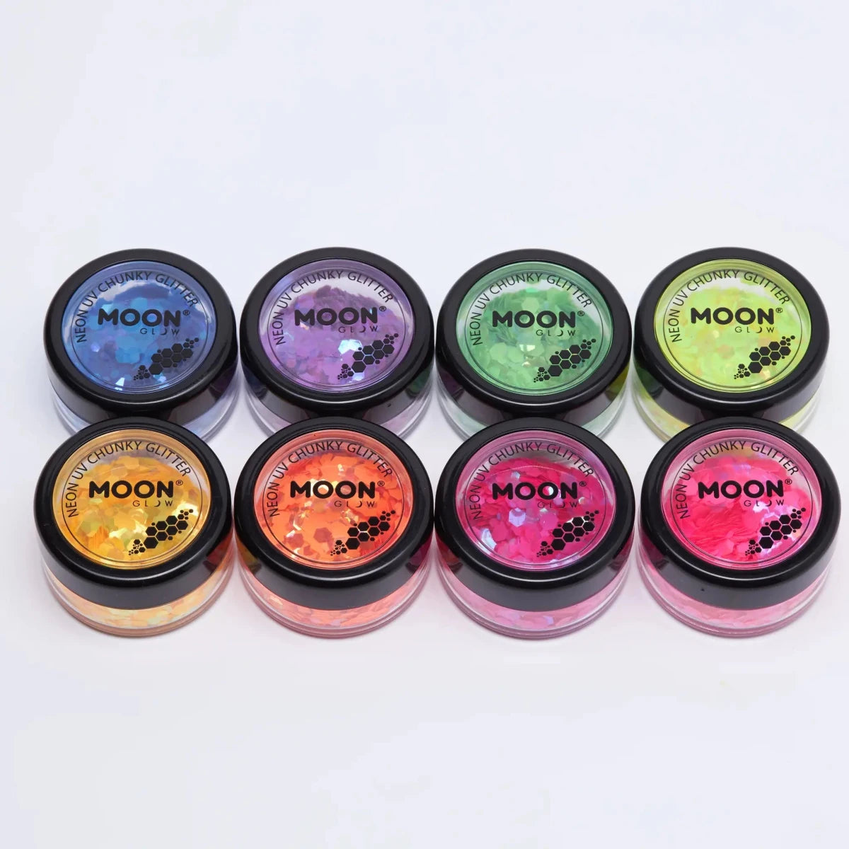 Les paillettes en morceaux Intense Neon UV de Moon Glow sont indispensables pour créer des looks saisissants qui brillent au néon le jour et qui brillent la nuit sous les lumières UV ou les blacklights. Où que tu sois - leur qualité de star vole la vedette!