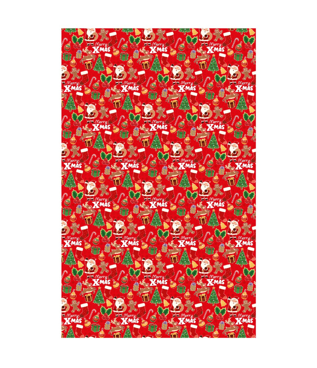 Couleur/dessin : rouge avec des figures de Noël (père Noël, sapin, cadeaux, bonshommes en biscuit)