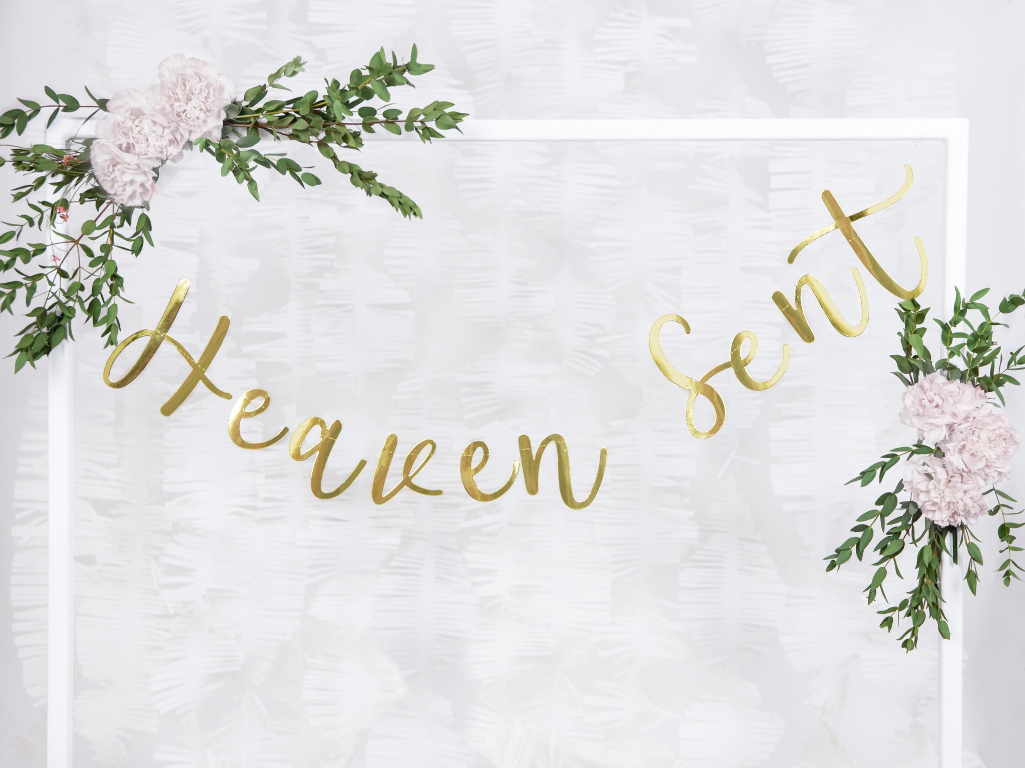Contenu : bannière cousue heaven sent en papier or miroir, taille : hauteur environ. 14,5 cm, longueur env. 85 cm.