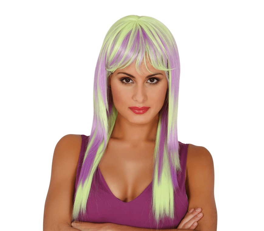 Perruque cheveux longs jaune fluo violet