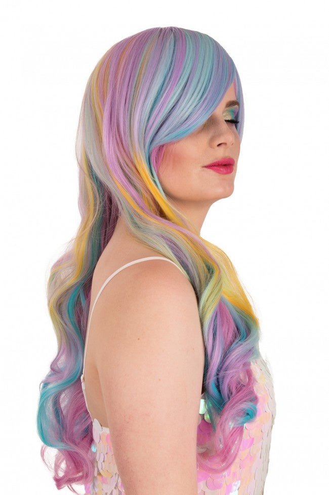 Perruque Selena longue avec boucles arc-en-ciel pastel avec franges inclinées
