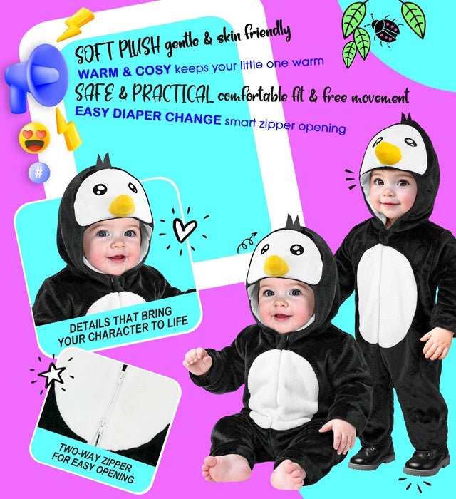 Dandine-toi joyeusement dans cet adorable costume de pingouin] en velours pelucheux. Grâce à sa matière confortable et à son design sucré, ce costume est parfait pour les jeunes amoureux des animaux.