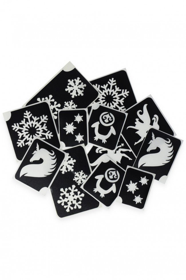 Le set contient 12 pochoirs de tatouage à paillettes. Utilise la colle spéciale pour la peau et les paillettes fines pour créer de magnifiques tatouages à paillettes.