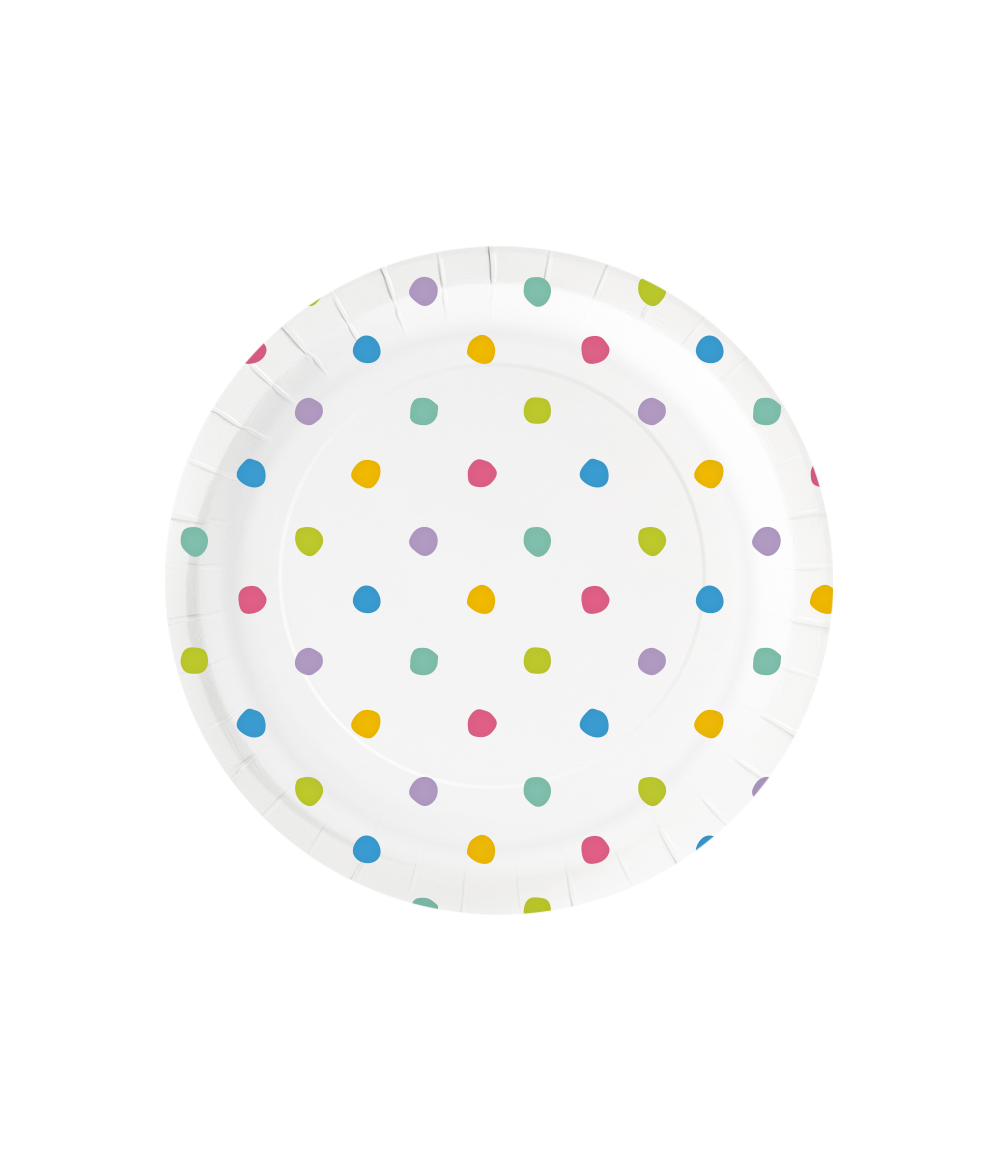 Complète la table de fête avec ces joyeuses assiettes Party Dots! Le motif ludique des points crée instantanément une atmosphère festive et rend les assiettes parfaites pour les gâteaux, les collations, les friandises et bien plus encore.