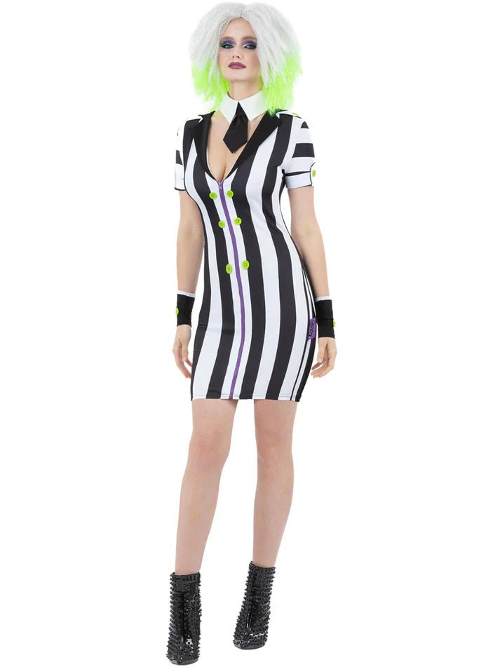 Cette robe chemise Beetlejuice comprenant un col, une fausse cravate et des poignets crée un look immédiatement reconnaissable. Le costume complet offre une tenue ludique et accrocheuse pour les occasions festives.