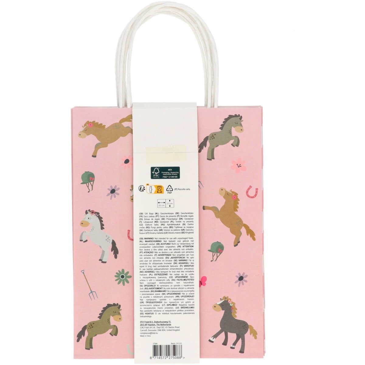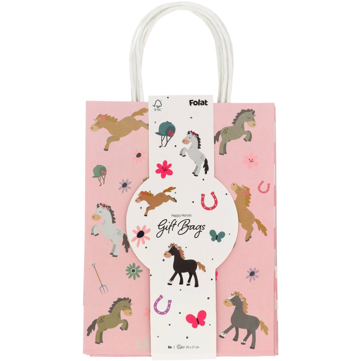 Tous les fans de chevaux veulent un sac comme celui-ci ! Sacs cadeaux - Happy Horses - 20 x 27 cm - 6 pièces. Contenu : 6 sacs cadeaux. À utiliser par exemple lors des fêtes/occasions suivantes : Fête d'enfants, Anniversaire, Fête à thème. Sacs cadeaux joyeux mesurant 20 x 27 x 10 cm. Imprimés en rose tendre avec des chevaux joyeux et tout ce qui va avec. Les côtés des sacs présentent un motif à carreaux rose clair, gris-vert et rose foncé sur fond blanc. Poignée comprise, les sacs mesurent environ 37 cm hoog.Deze sacs cadeaux appartiennent à la collection Happy Horses de Folat. Cet article est fabriqué en papier.
