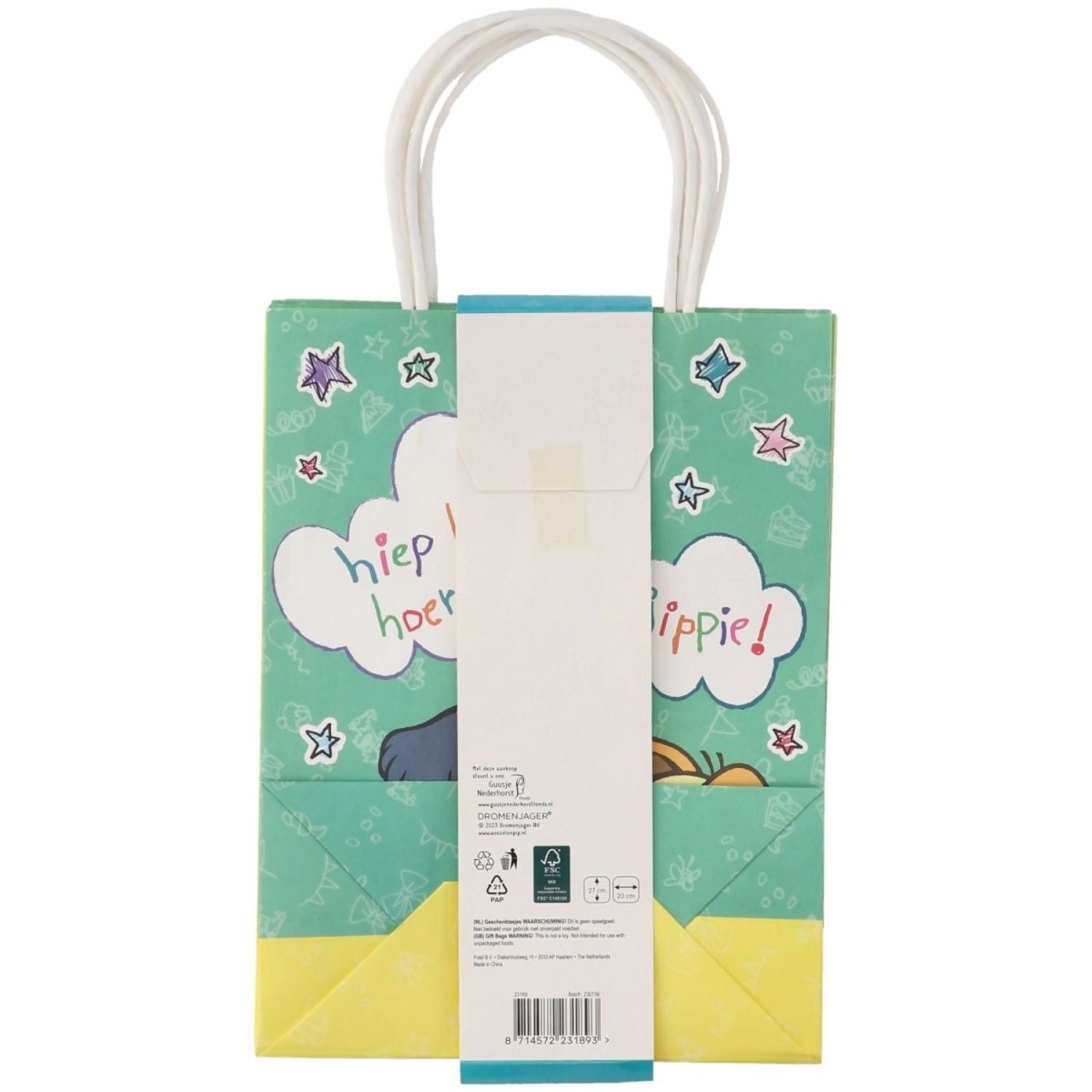 Des sacs spéciaux pour des amis spéciaux ! Sacs de fête, Woezel et Pip, 27 x 20 cm, 6 pièces. Contenu : 6 sacs à distribuer. À utiliser par exemple lors des fêtes/occasions suivantes : Anniversaire, Fête des enfants. La gaieté éclate, ce qui rend ces sacs vraiment typiques de Woezel et Pip. Assez grands pour des cadeaux spéciaux destinés à des amis spéciaux, mais aussi très agréables pour des friandises. Un côté est jaune avec tous les amis réunis et l'autre côté est vert avec Woezel et Pip. Cet article est fabriqué en papier FSC