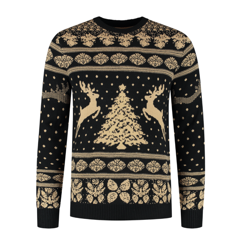 Ce pull de Noël en forme de renne sauteur combine un look moderne avec une touche festive. Le pull est en noir et décoré d'un élégant motif de renne couleur or, ce qui lui donne un aspect luxueux mais ludique. Parfait pour ceux qui veulent un pull festif qui a l'air juste un peu plus fantaisiste que les imprimés de Noël classiques.