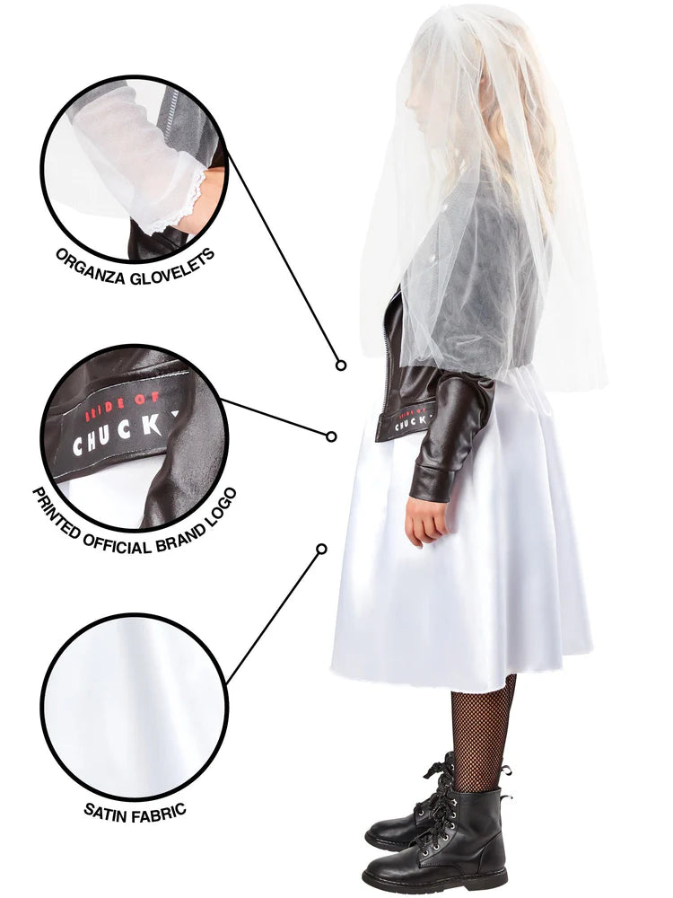 Laisse ton petit fan d'horreur se transformer en Tiffany, la tristement célèbre mariée de Chucky. Avec cette tenue complète, comprenant une robe avec une veste attachée, un voile et des gantelets, ils seront dans la peau de la poupée emblématique de la célèbre série de films en quelques secondes. Amusement supplémentaire : combine-le avec les costumes Chucky et Tiffany assortis pour toute la famille, des tout-petits aux adultes.