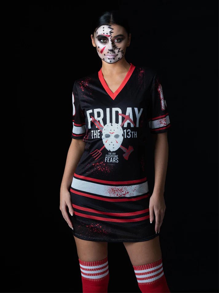 Transforme-toi en un look d'horreur classique avec ce déguisement féminin Vendredi 13. La robe comporte un imprimé hockey et est parfaite pour Halloween, les fêtes à thème ou les cosplays.